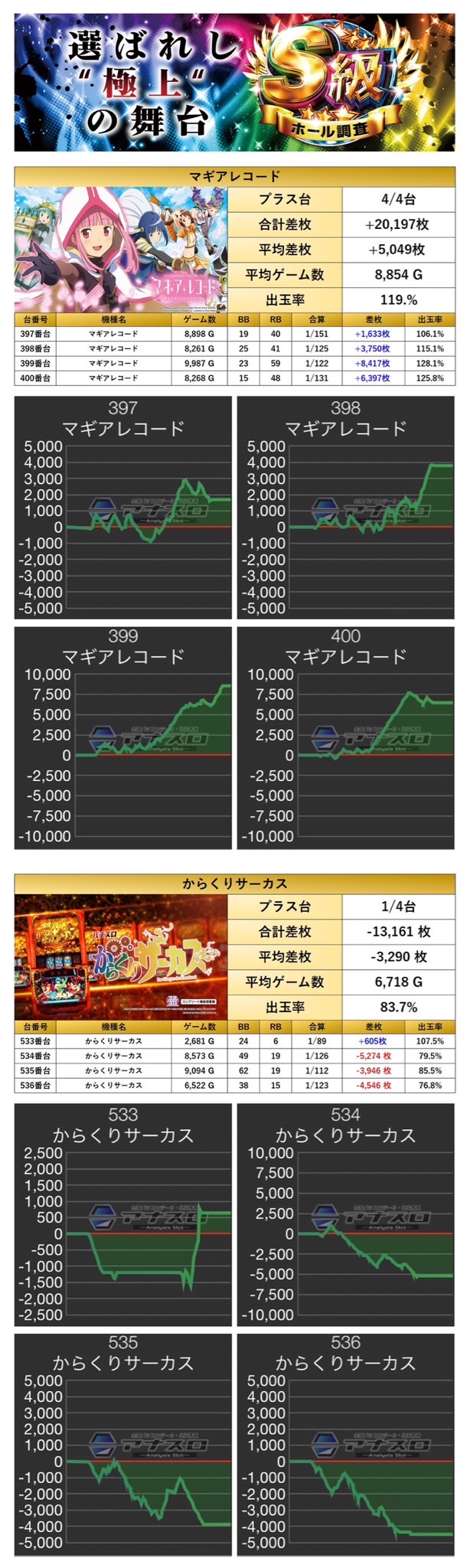 平均差枚+880枚、平均出率103.8%とマギアレコードは安定して綺麗な右肩上がりと調子が良さそうだ。一方でからくりサーカスは下振れしてしまった。