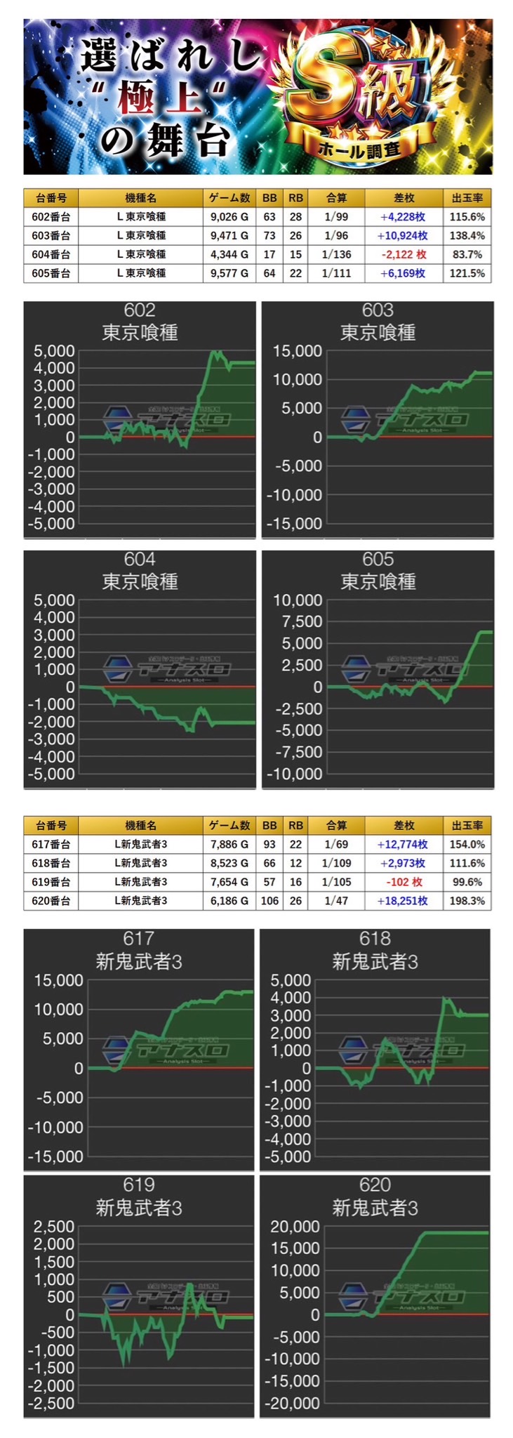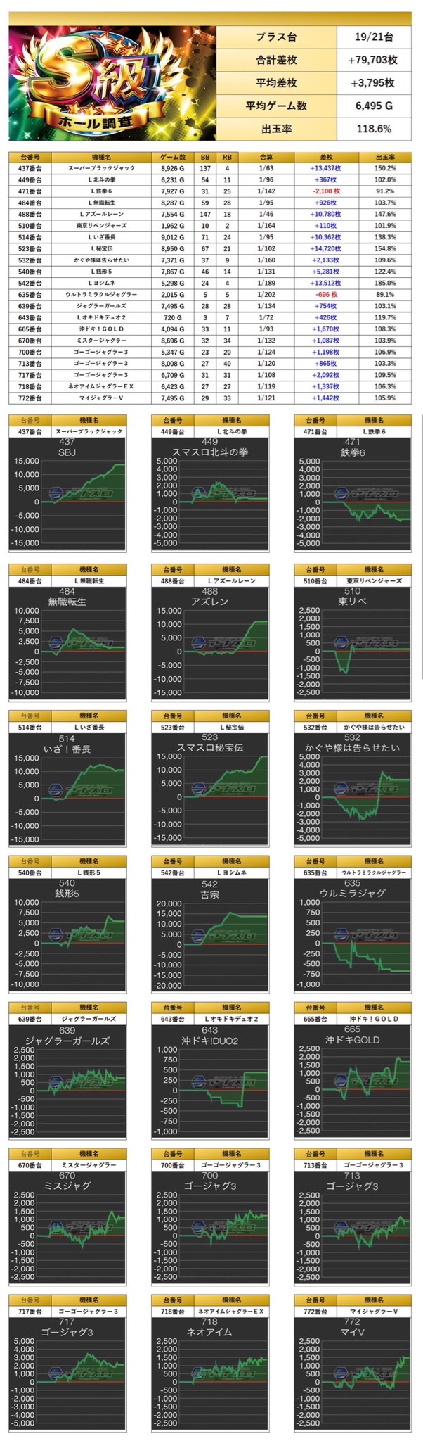 平均差枚は+3,795枚、平均出率118.6%とスマスロ、メダル機の多彩な機種がpick up対象となった。