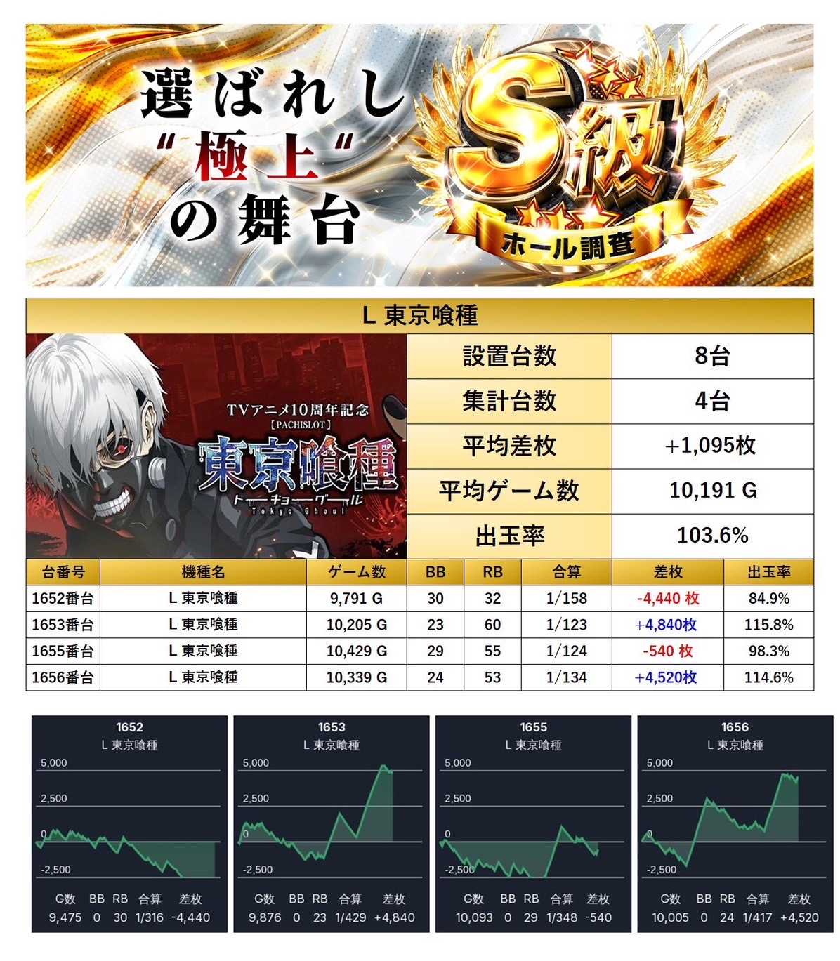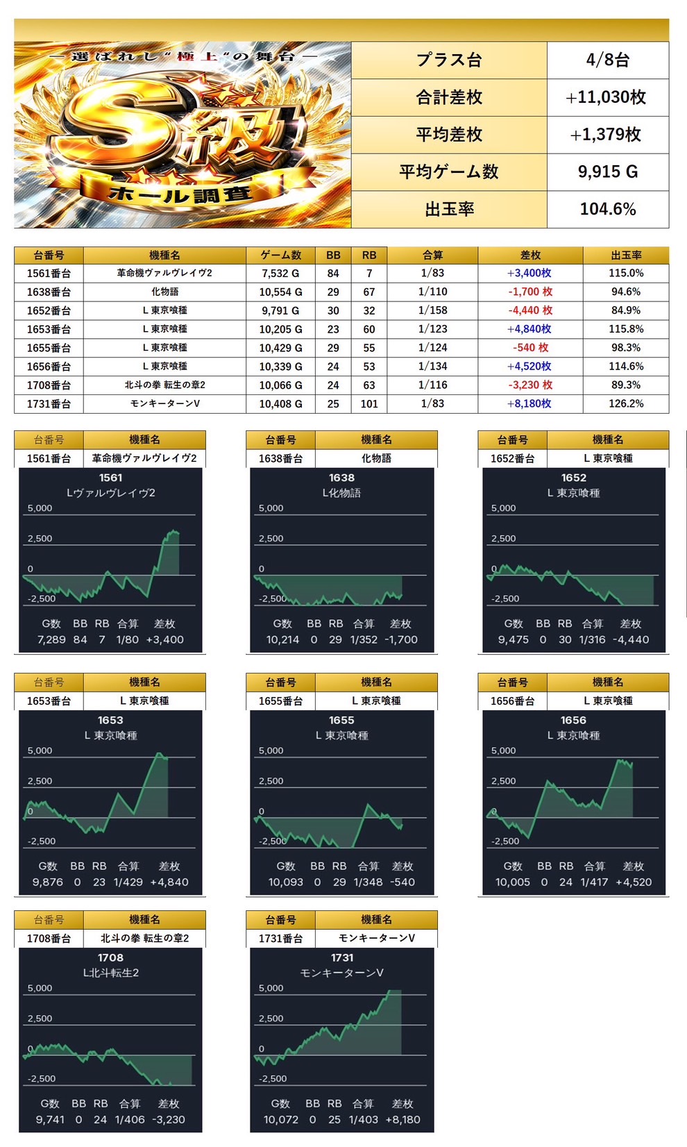 平均差枚+1,379枚/出率104.6%と6台が万回転と打ち込みは素晴らしいが、少し控えめな結果となった。