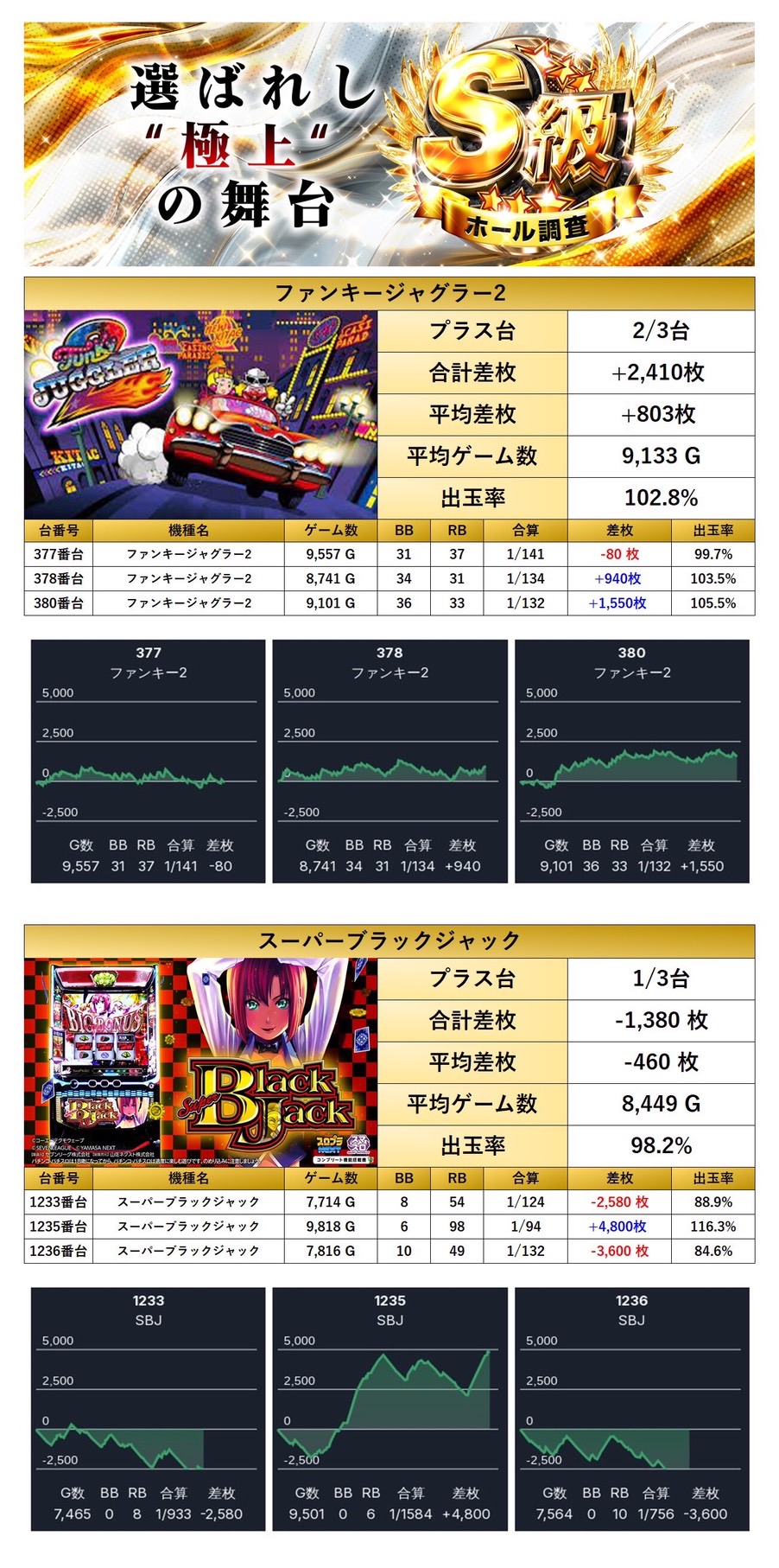 「ファンキージャグラー」「スーパーブラックジャック」の2機種6台がピックアップされた。