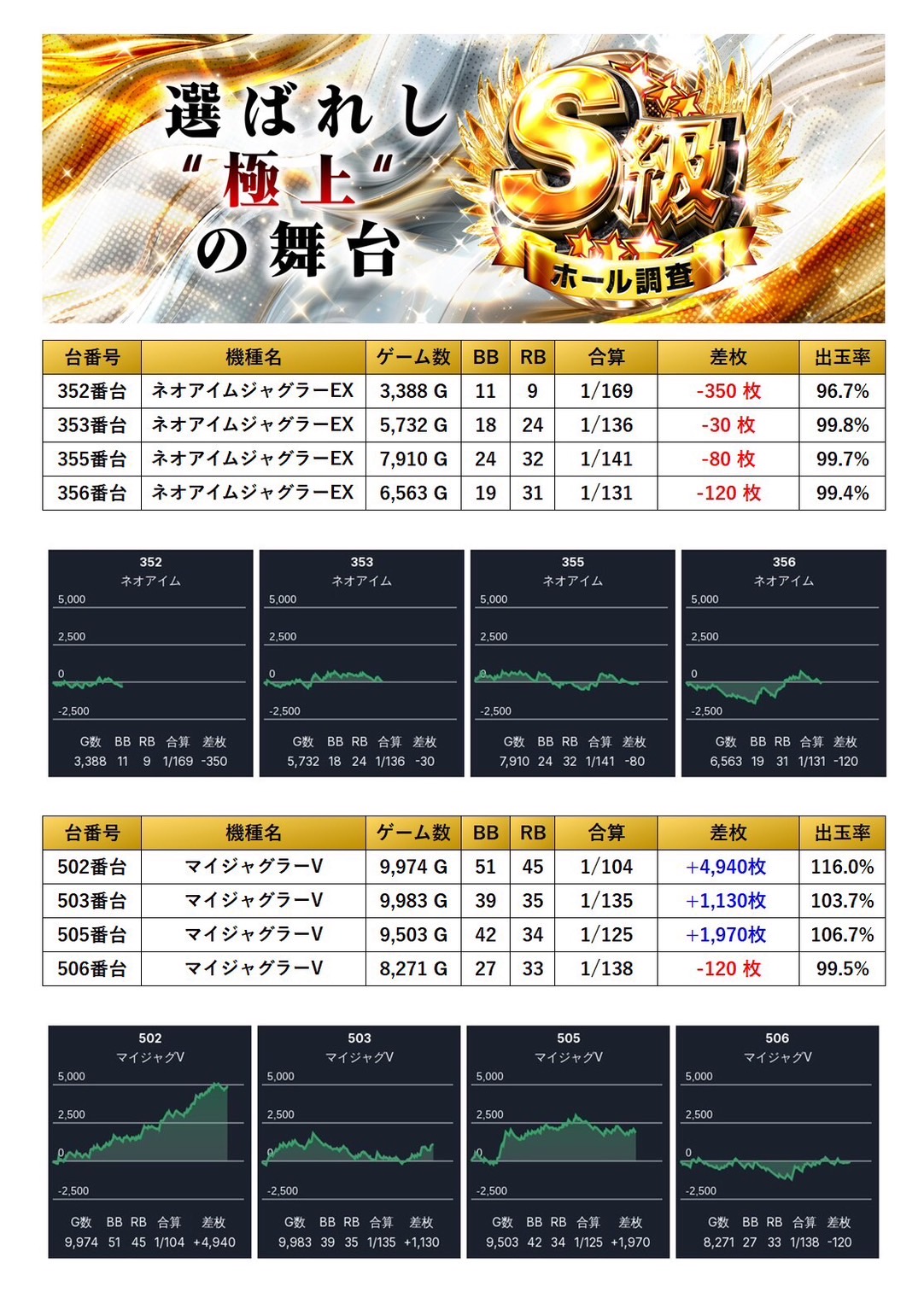 4台並びを計2箇所で仕掛けが確認され、平均差枚+918枚/出率103.9%とジャグラーが対象になっており局所では圧巻の出率となった。