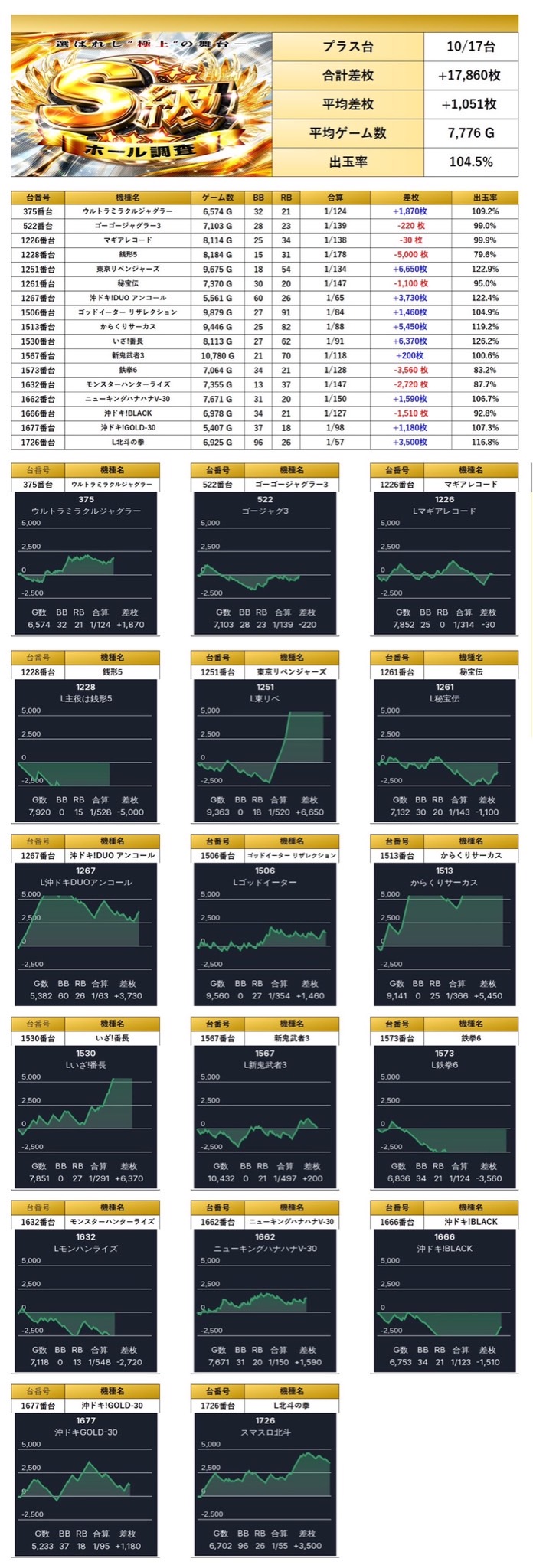 合計17台がピックアップされ、平均差枚+1,051枚/出率104.5%をマーク。多彩な仕掛けが確認された。