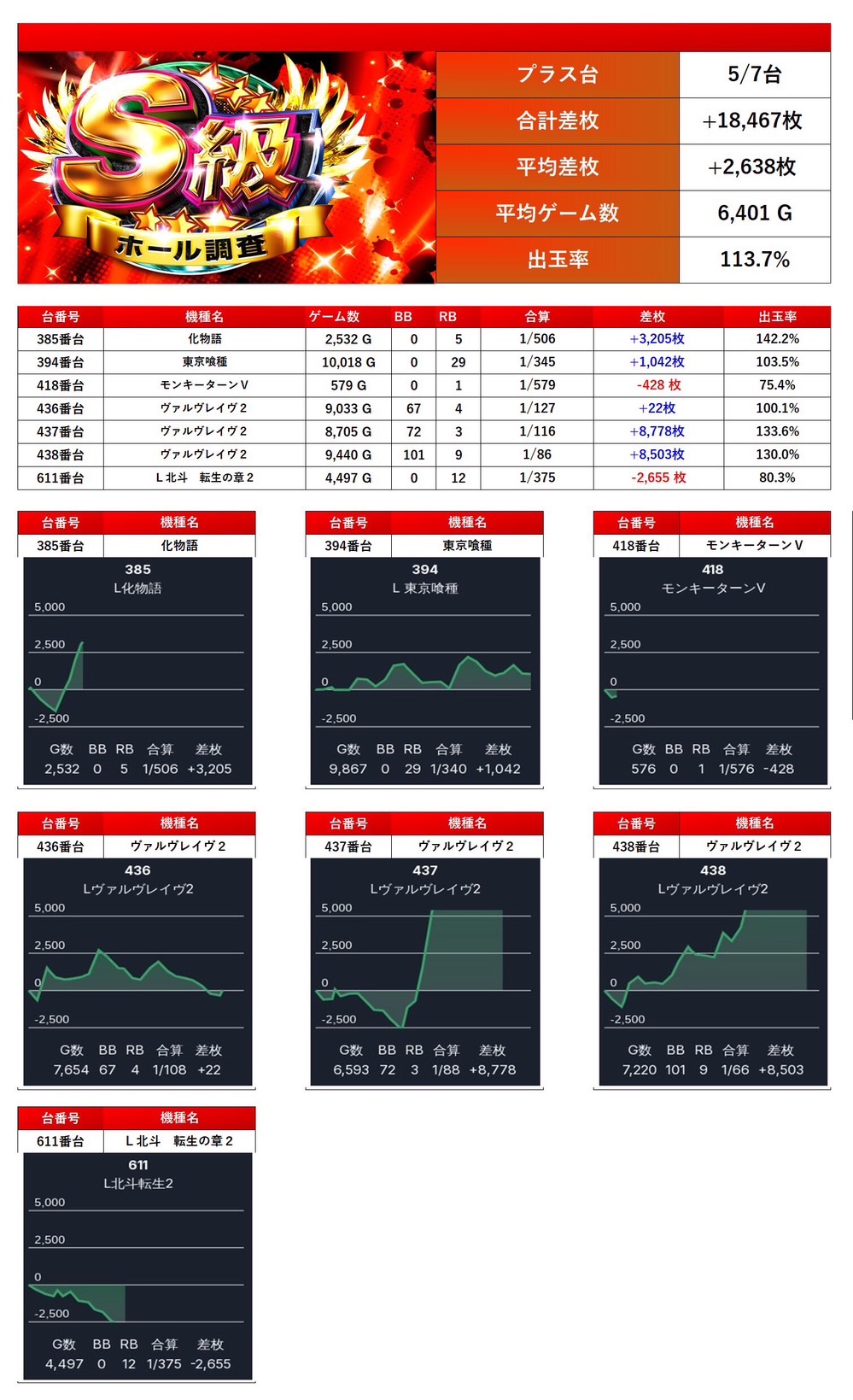 合計7台の平均差枚は +2,638枚、平均出率は 113.7% ときかけの規模は小さいがメイン機種らしい安定した出率だった。