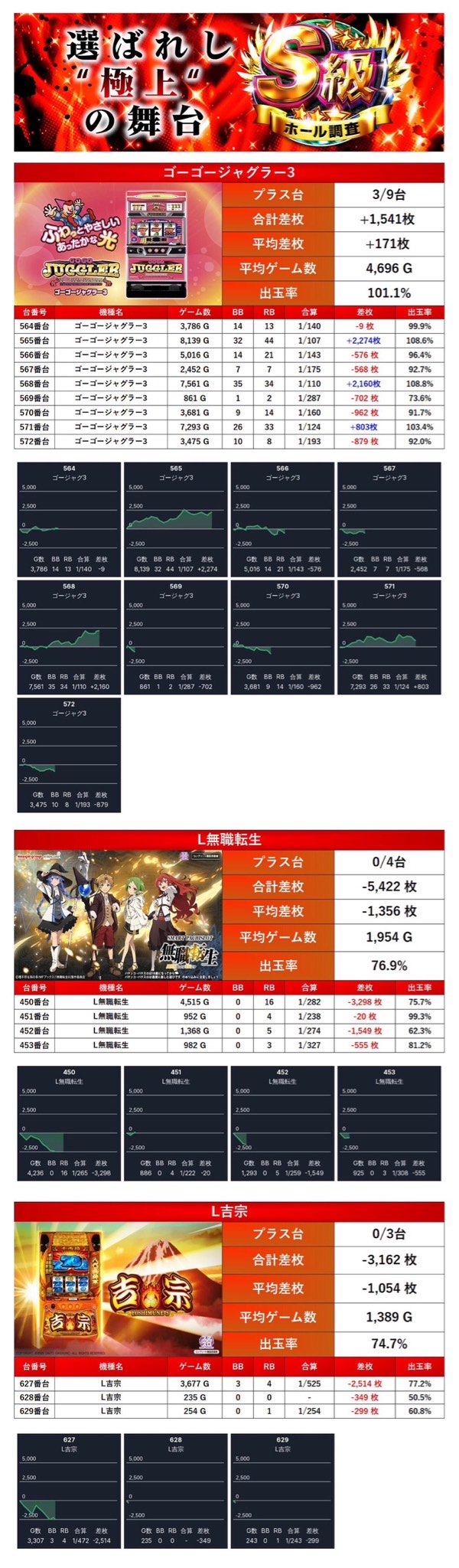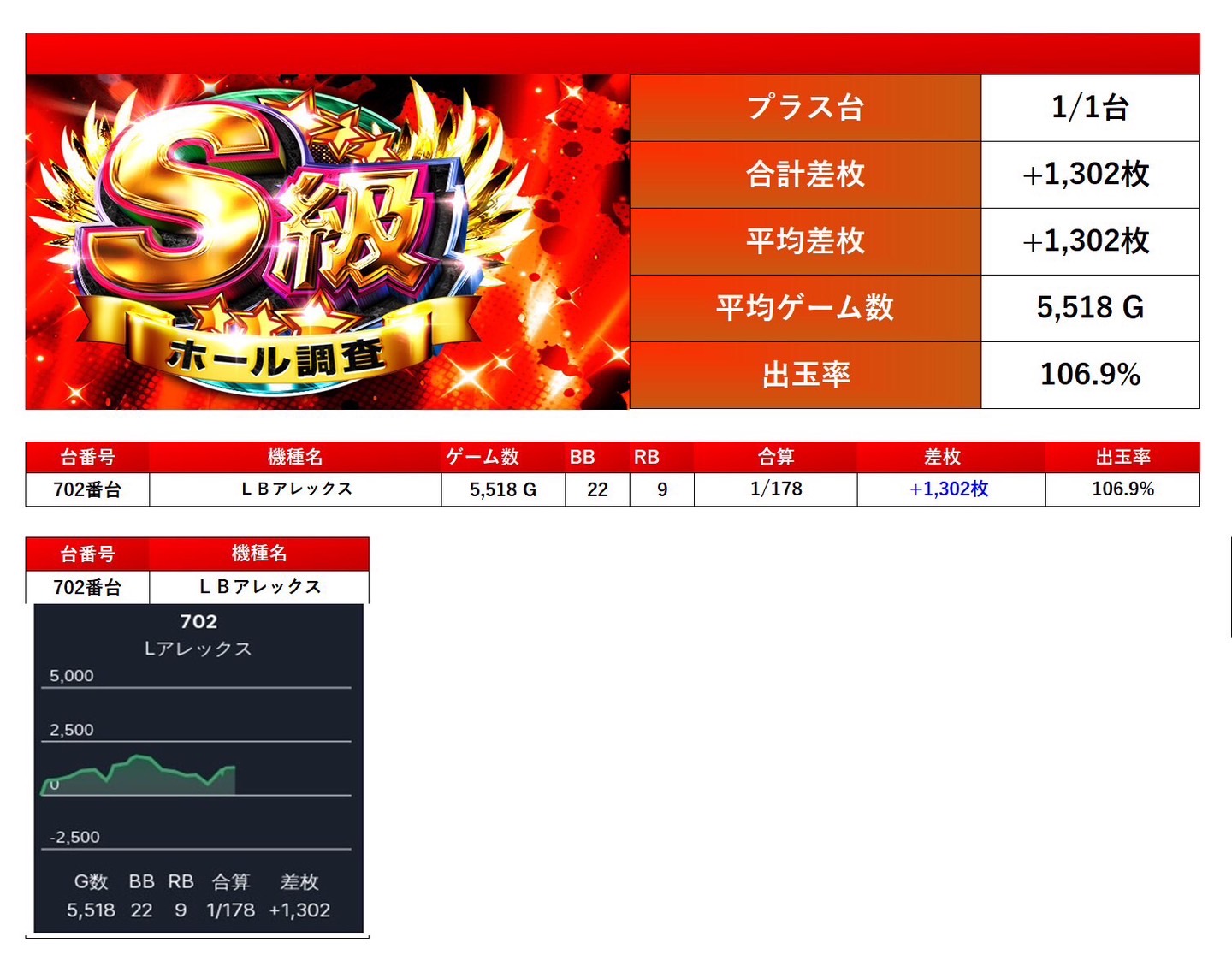 36回目となったS級調査-赤-では全台の仕掛けはpickup率は8.2%で局所的な仕掛けで集計された機種の平均出率が103.9%となった。全館の総差枚は−2,336枚/平均−8枚となり、仕掛けの量・出率どちらも大幅に不足し今回は一つ星評価となった。前回が三つ星だっただけに残念な結果だ。仕掛けの規模が小さく、明確な狙いも見分けづらい構成で現状では積極的に評価できる要素が少なく、今後の改善と仕掛けの強化が求められる結果となった。