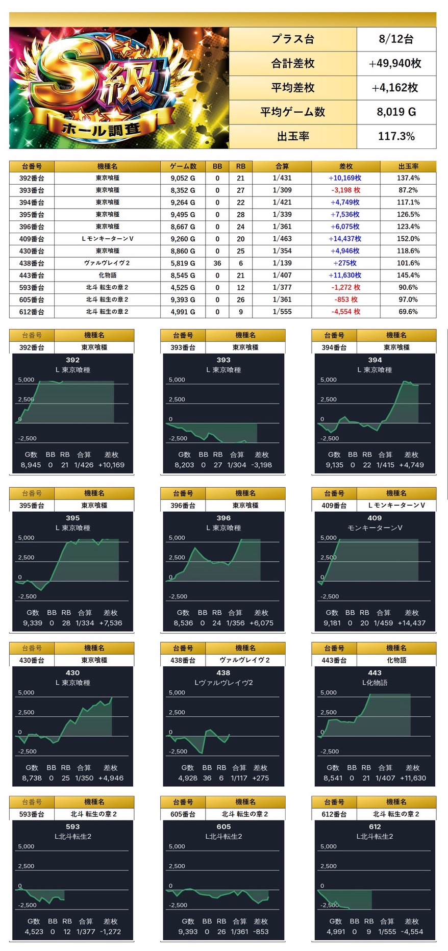 17回目となったS級‐虹‐ではpick up率は17.4%と安定した仕掛け量となり、総差枚数+101,337枚/平均+347枚と圧巻の好成績で納得と三つ星を獲得した。高稼働で内容・結果共に素晴らしい結果だった。