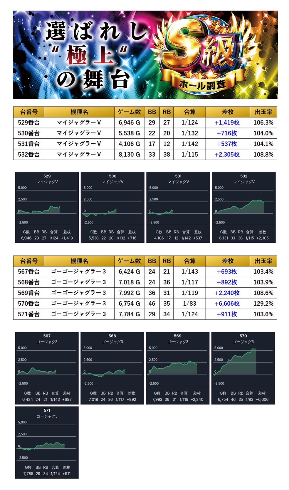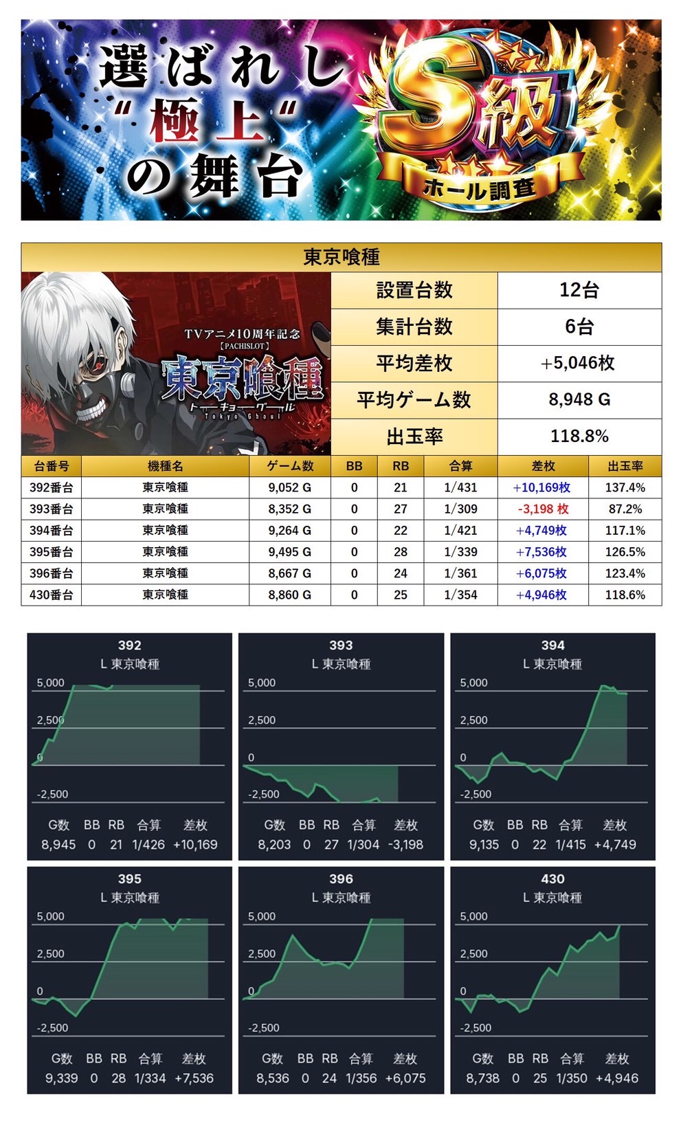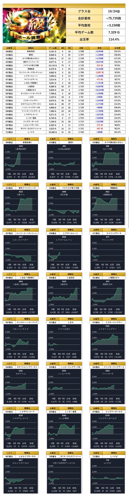 平均差枚+3,156枚、平均出率114.4%と、随所から多彩な人気機種がpick upされた。