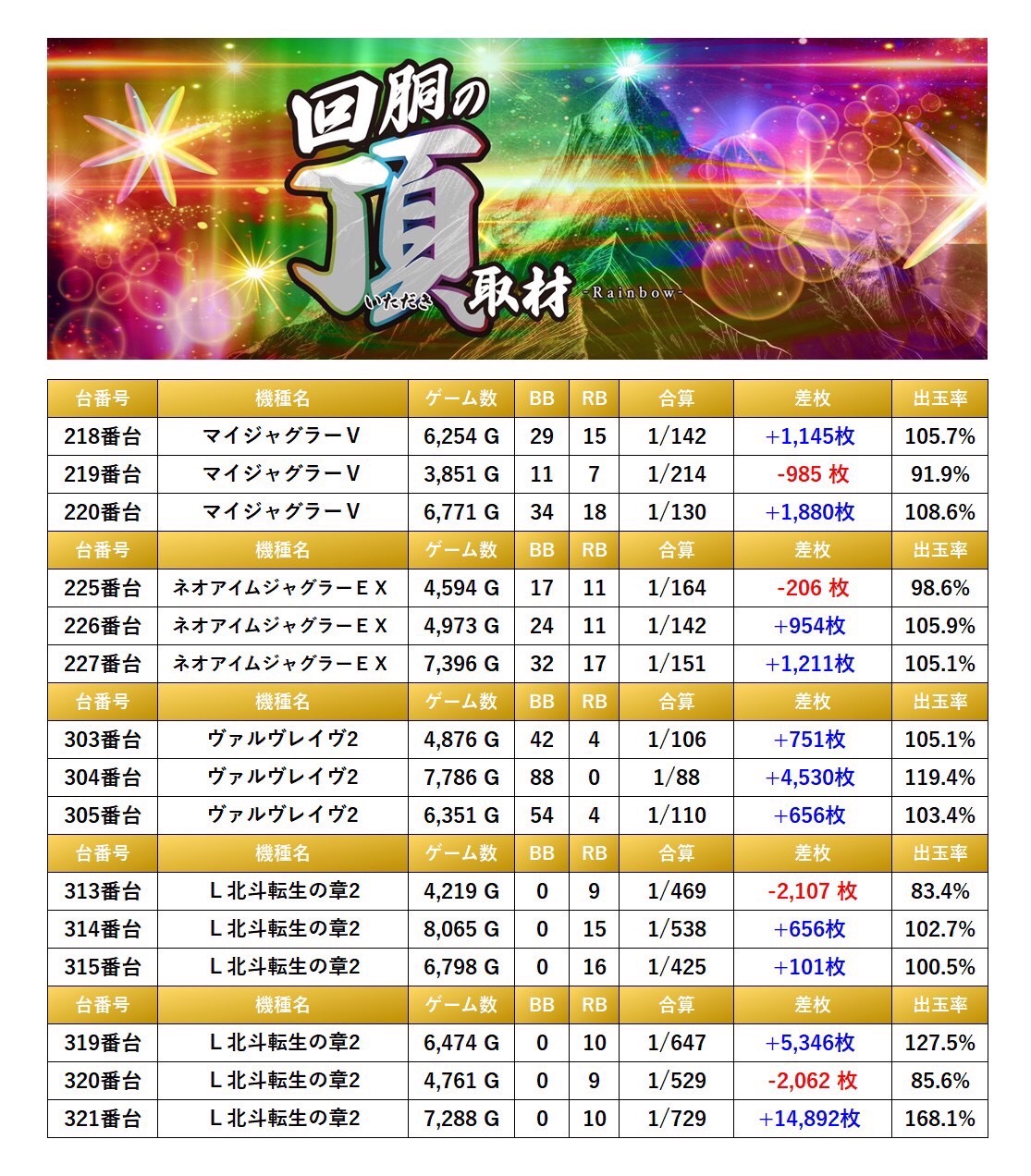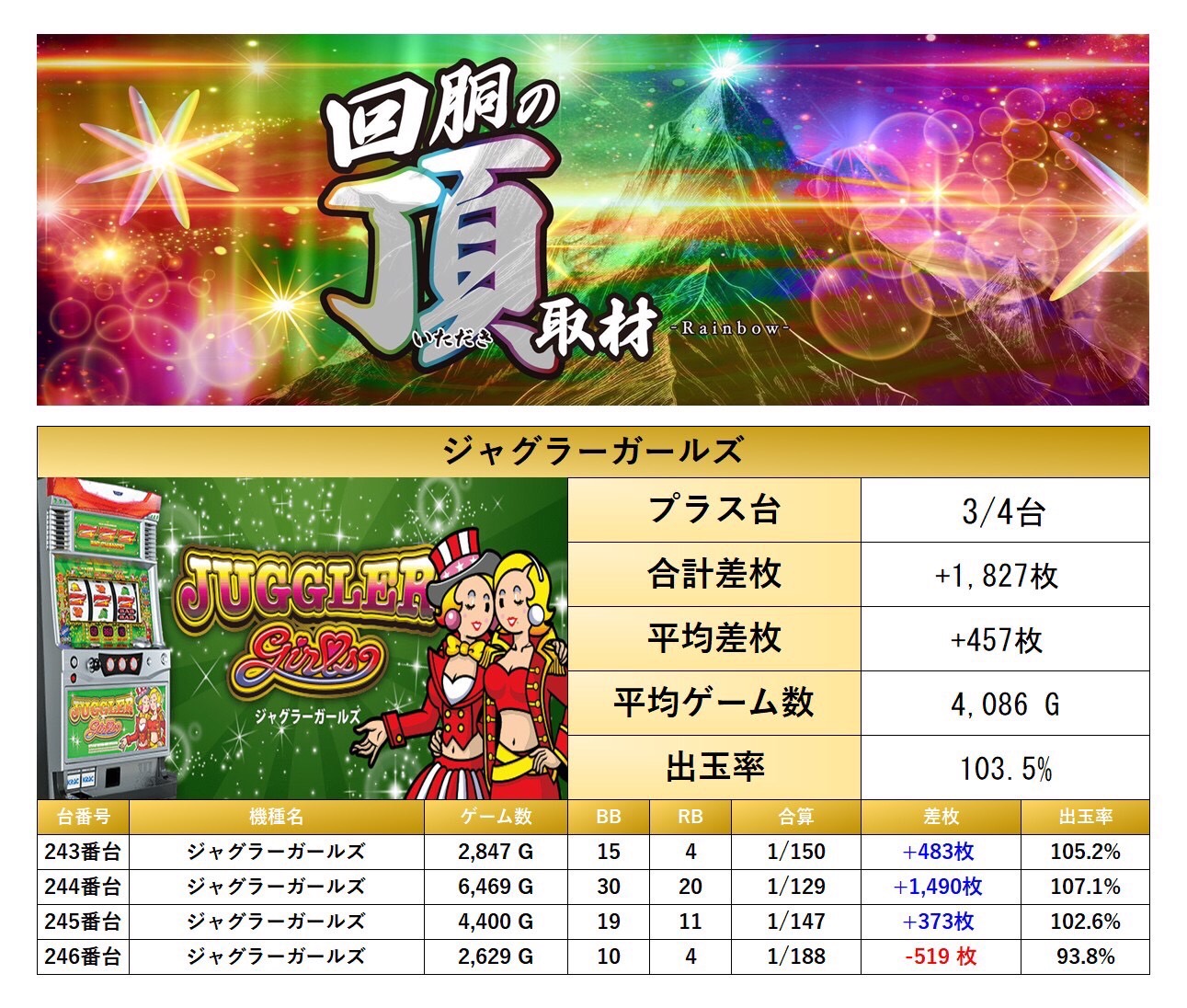 「ミスタージャグラー」の1機種をpick upする。1機種4台の平均差枚は+457枚で平均出率が103.5%だった。