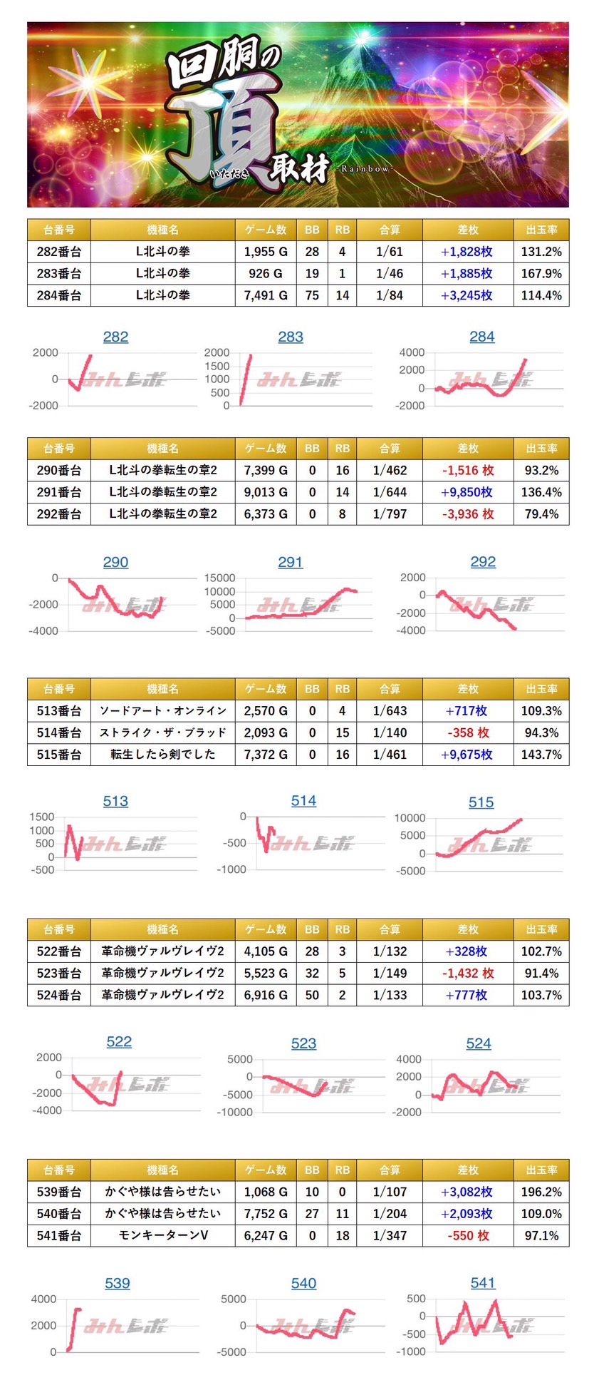 単独開催!回胴の頂取材-虹-は人気機種の並びが優秀な結果!