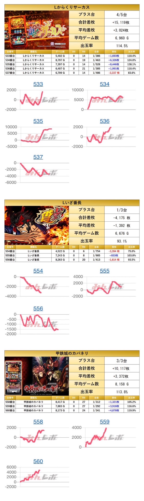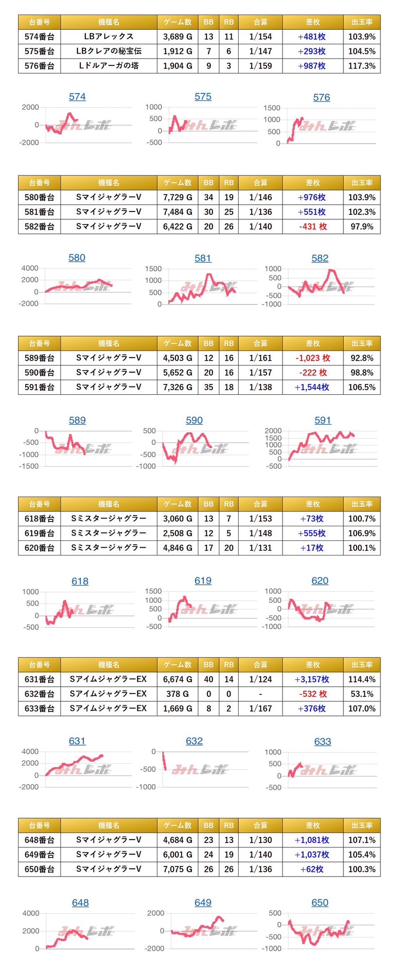 各所から3台以上の並びを計11箇所を見つけることができた。平均差枚は+1,051枚で平均出率が106.9%だった。