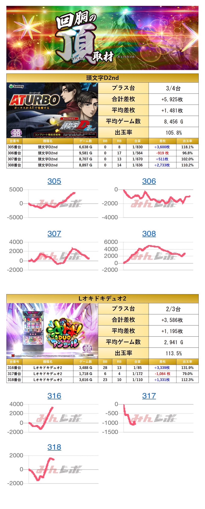「頭文字D 2nd」「沖ドキDUOアンコール」「からくりサーカス」「いざ!番長」「甲鉄城のカバネリ」の5機種をpick upする。5機種18台の平均差枚は+1,698枚で平均出率が108.4%だった。