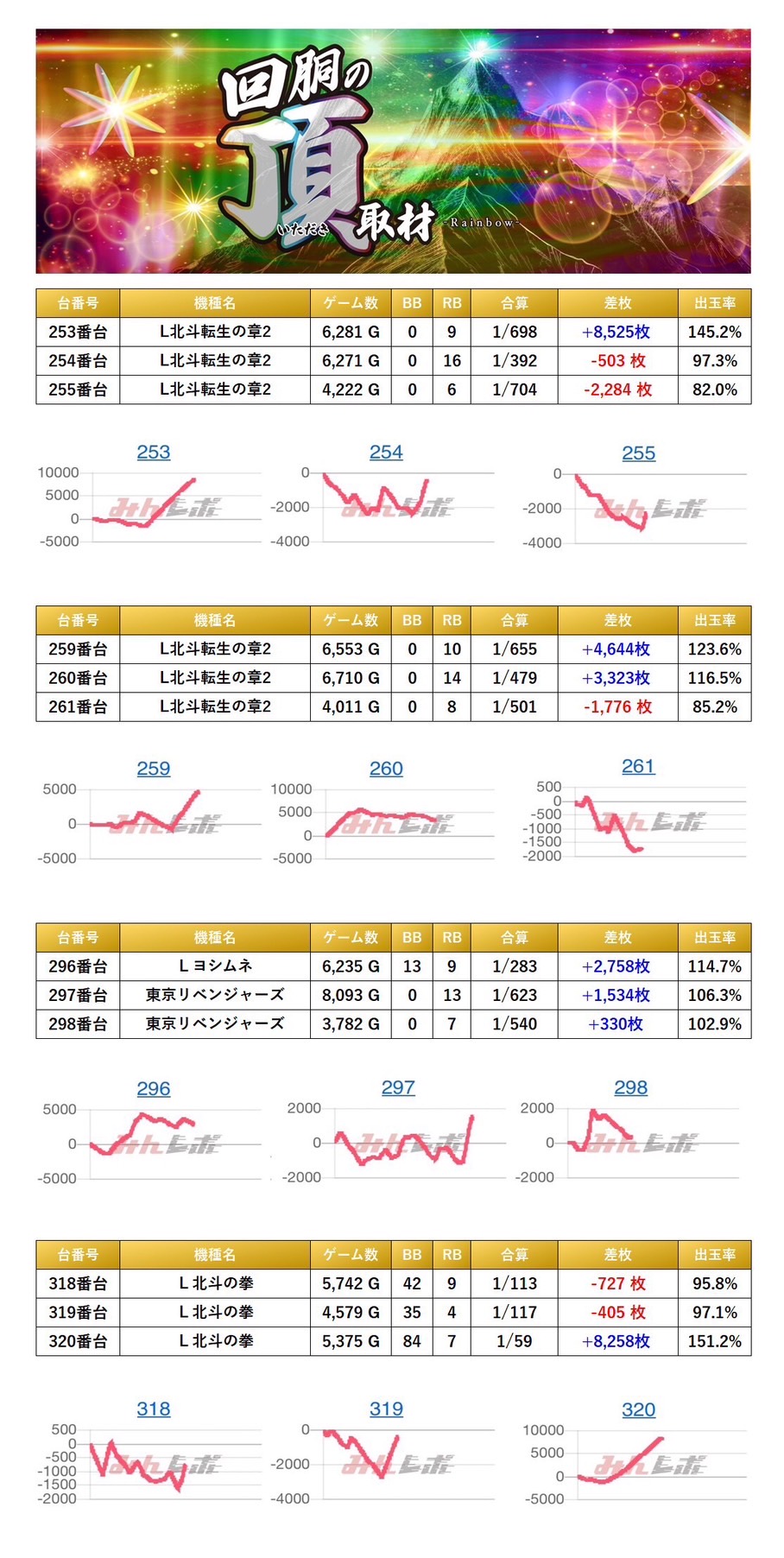 4機種15台の平均差枚は+2,737枚で平均出率が112.9%だった。