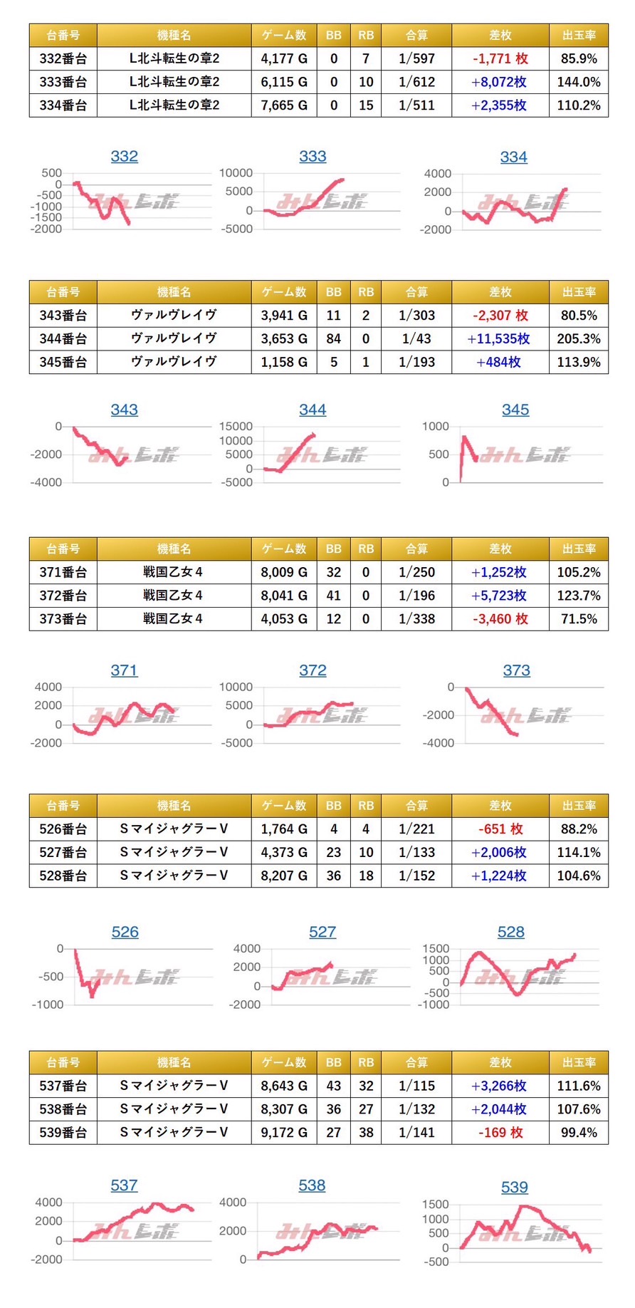合計9箇所の平均差枚は+1,973枚で平均出率が111.2%だった。