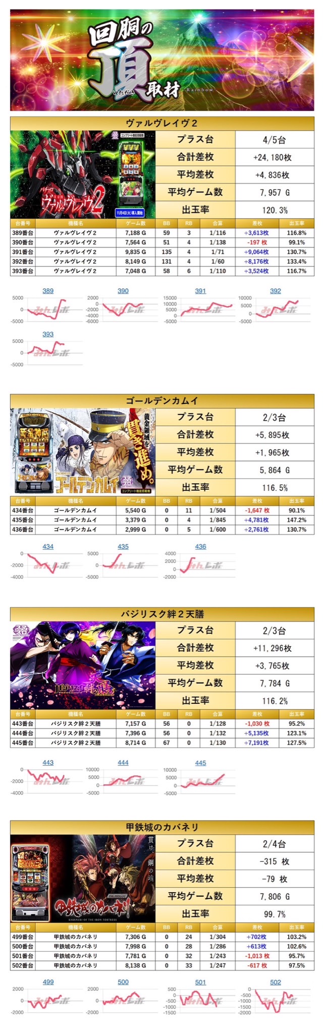 「ヴァルヴレイヴ2」「ゴールデンカムイ」「バジリスク絆2天膳」「甲鉄城のカバネリ」の4機種をpick up。