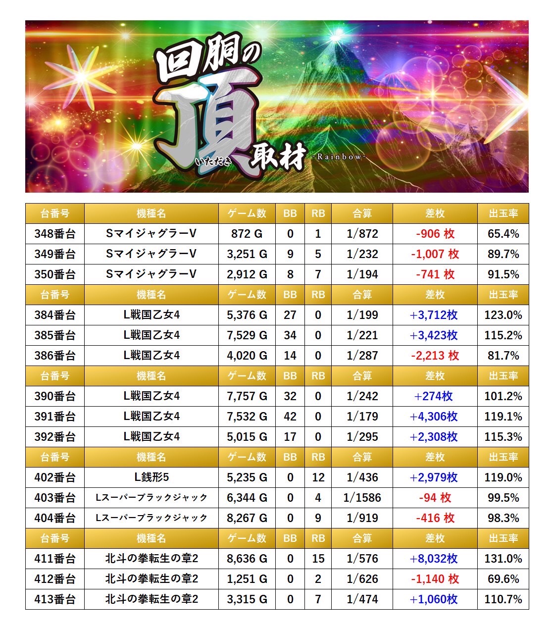 メダル機、ジャグラー、スマスロから3台以上の並び合計5箇所をpick upする。平均差枚は+1,305枚で平均出率が108.4%となった。