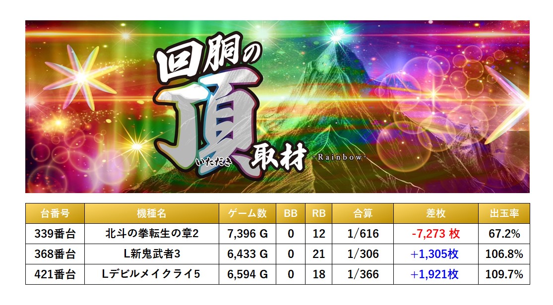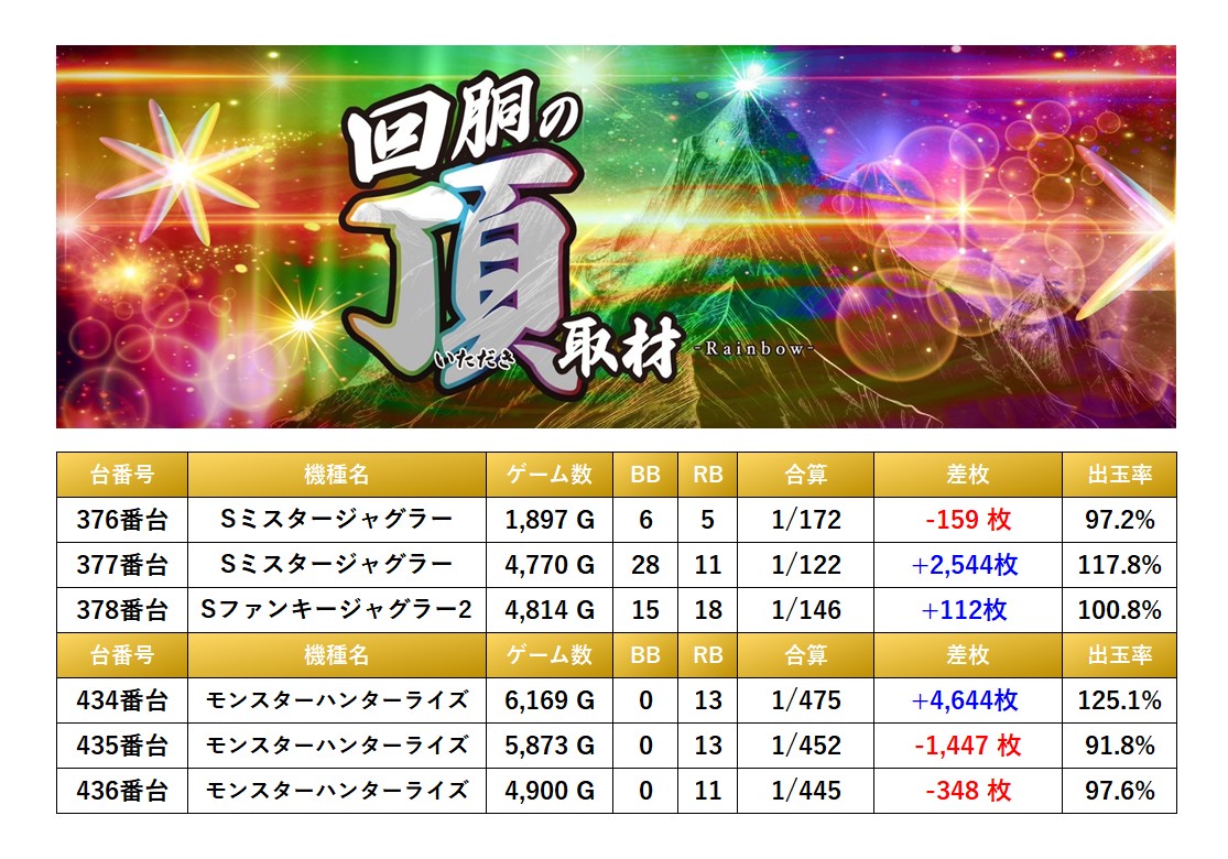 全体から3台のpickupすることができた。3台の平均差枚−1,349枚、平均出率93.4%となった。
