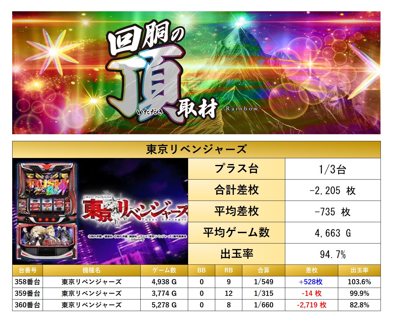 対象になった機種は「東京リベンジャーズ」の1機種3台となった。平均差枚−735枚、平均出率は94.7%だった。