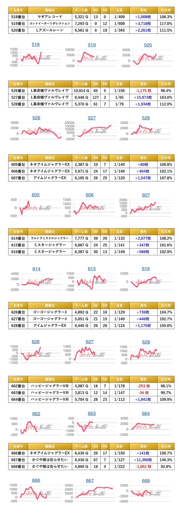 各所から3台以上の並びを計13箇所を見つけることができた。平均差枚は+2,317枚で平均出率が112.5%だった。