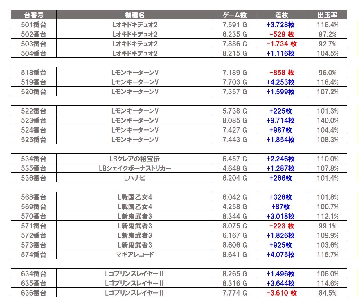 随所で優秀台を7台pick upする。平均差枚は+1,924枚、平均出率109.7%となった。