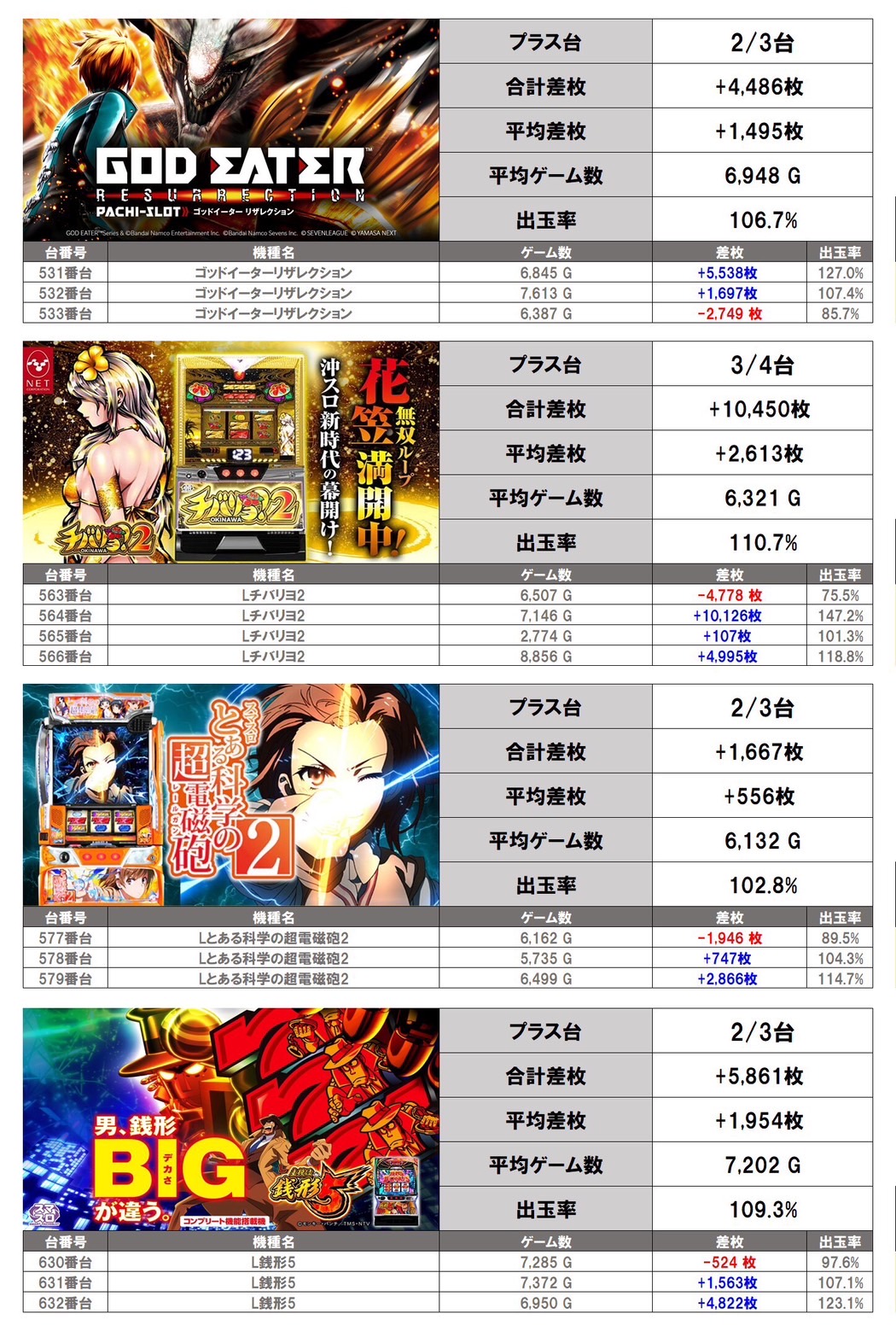 「ゴットイーター」「Lチバリヨ2」「とある科学の超電磁砲2」「銭形5」の4機種をpick up。平均差枚は+1,728枚、平均出率108.7%となった。
