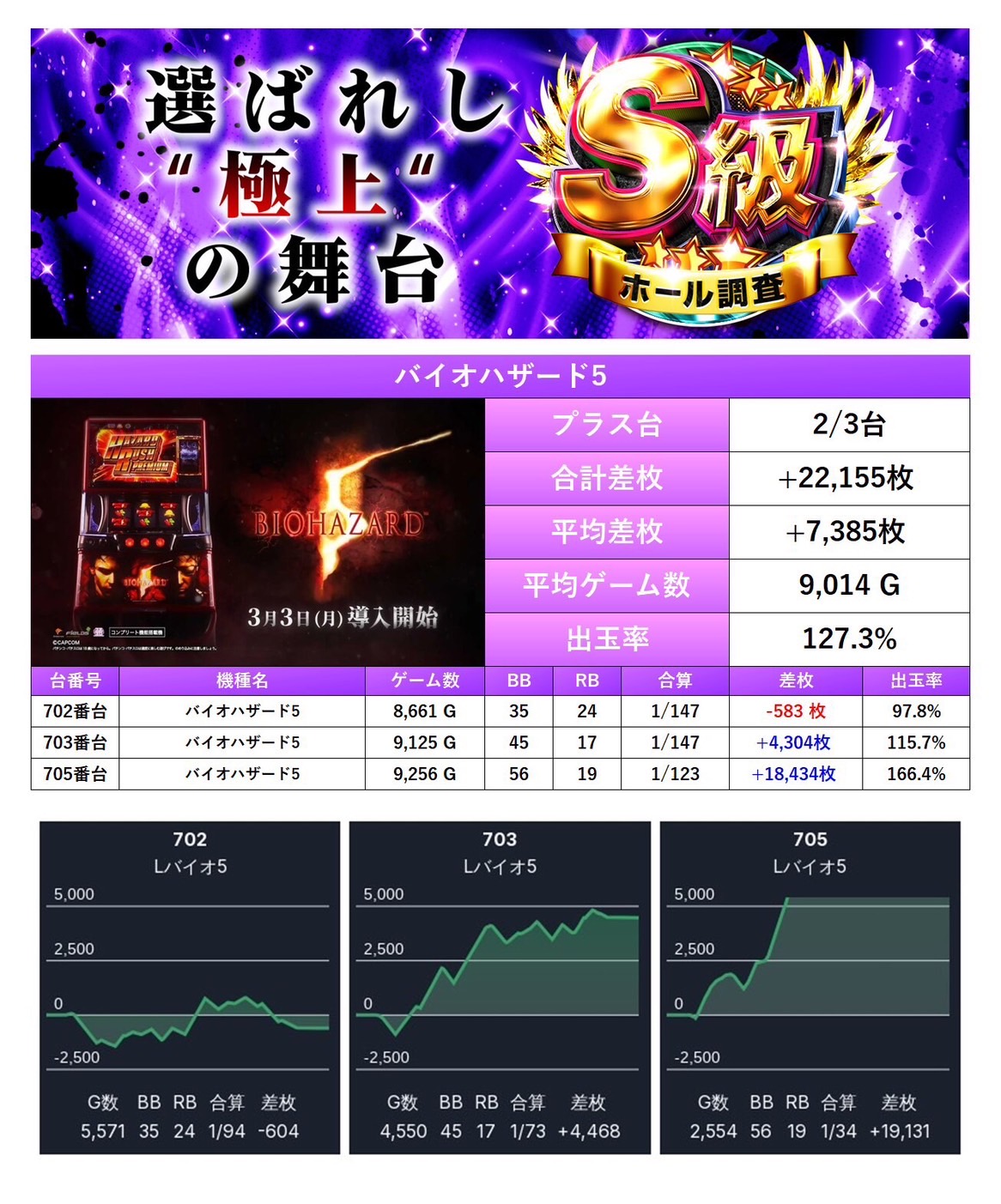「バイオハザード5」をピックアップ。1機種合計3台の平均差枚は+7,385枚で平均出率127.3%と圧巻の出玉を叩き出し素晴らしい出率となった。