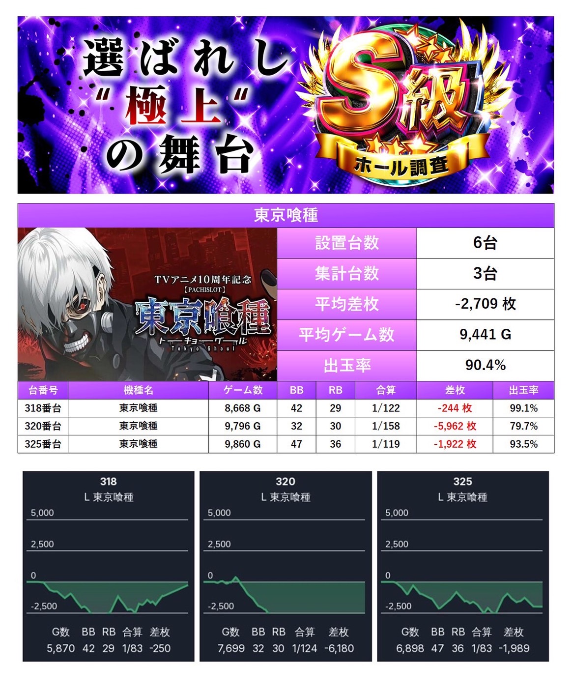 「東京喰種」「ヴァルヴレイヴ2」「モンキー」「化物語」「北斗の拳転生2」の定番5機種から優秀台を発見!