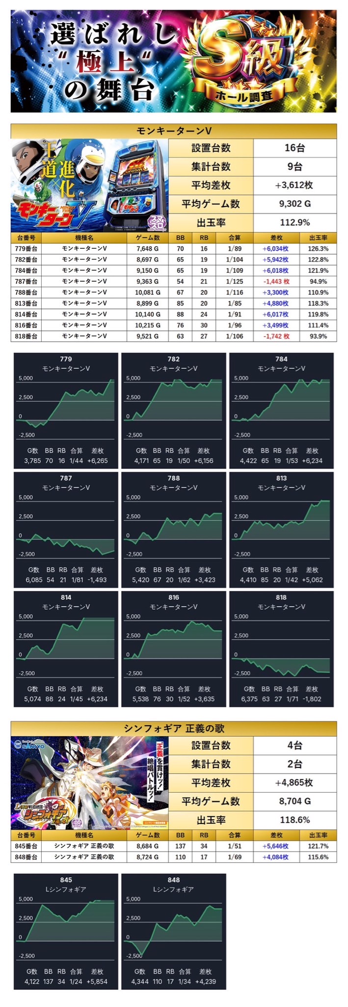 メイン機種からは「モンキーターン」さらには「シンフォギア正義の歌」の2機種11台をpick upする。