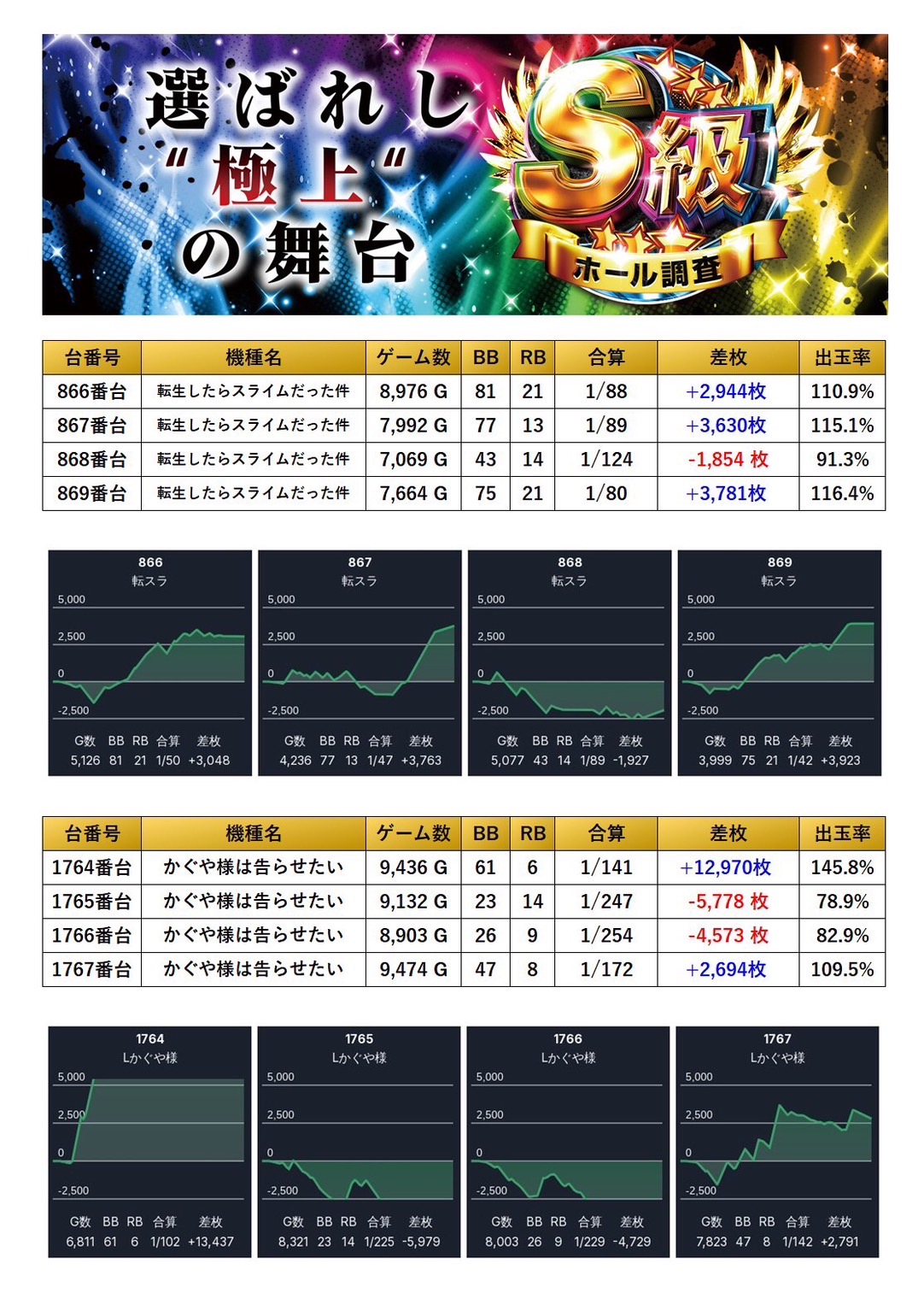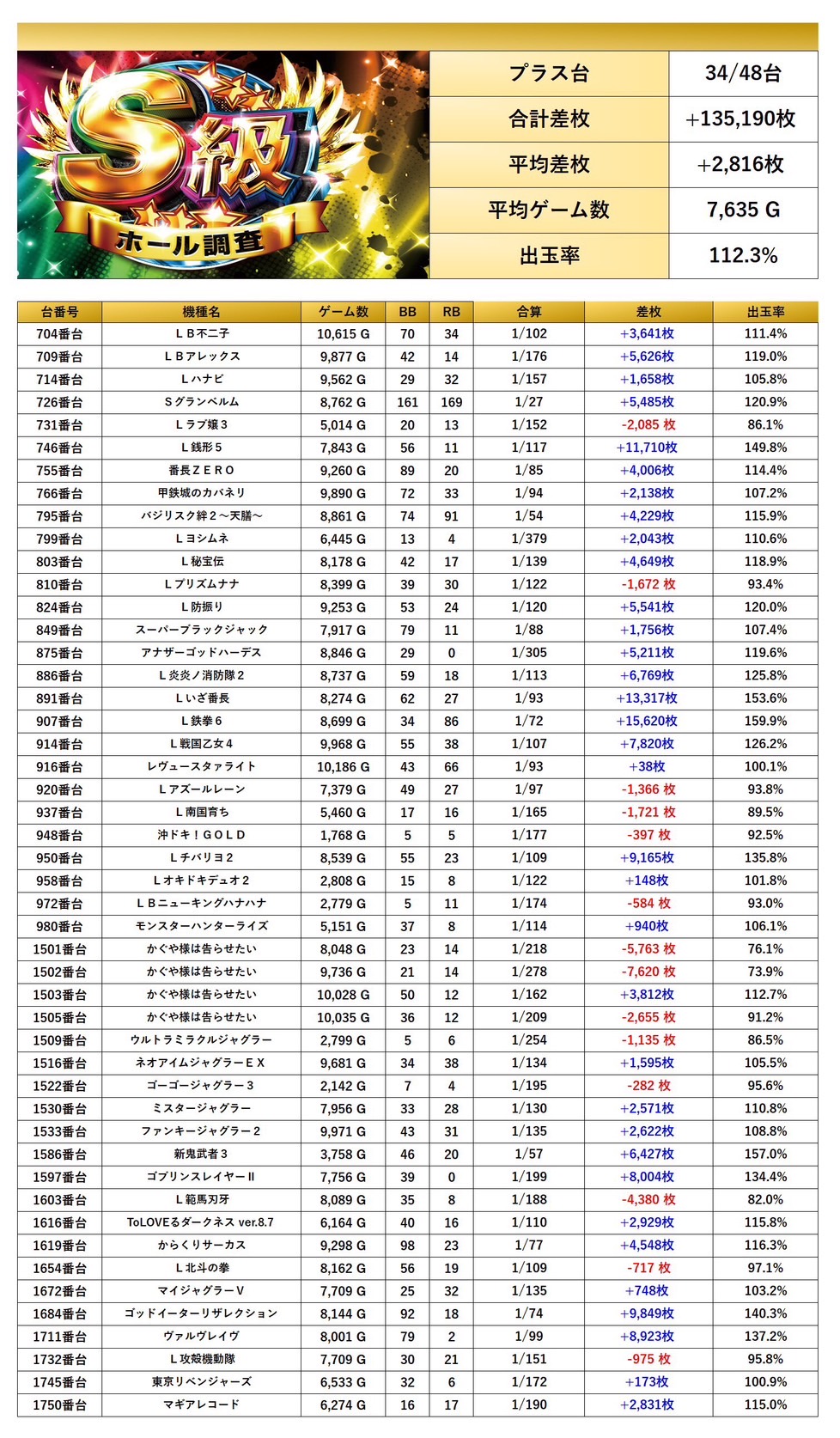 14回目となったS級調査-虹-は抽選388名/一般5名と沢山のユーザーが足を運んでくれた。今回は全体から15.1%のpick up率となり、全館差枚こそマイナスになってしまったが集計された機種の総差枚は大幅にプラスで質の高さが伺えた。「メイン機種」では勝率も高く出率も安定し、「全台系」では3機種が対象となり、爆発的な出玉も見られ出率は圧巻と素晴らしい結果を残した。「ニブイチ」では2機種pick upされ、こちらもしっかり打ち込まれ出率も文句なしの結果だ。「並び仕掛け」からは4台並びが2箇所確認され、「4台設置以上機種」からは48台がpick upとバランスのいい仕掛けで抽選が悪くてもチャンスは掴めそうだ。いずれもしっかり打ち込まれ、ユーザからの信頼が伺えた。総じて今回は惜しくも二つ星評価となった。次回も期待している。