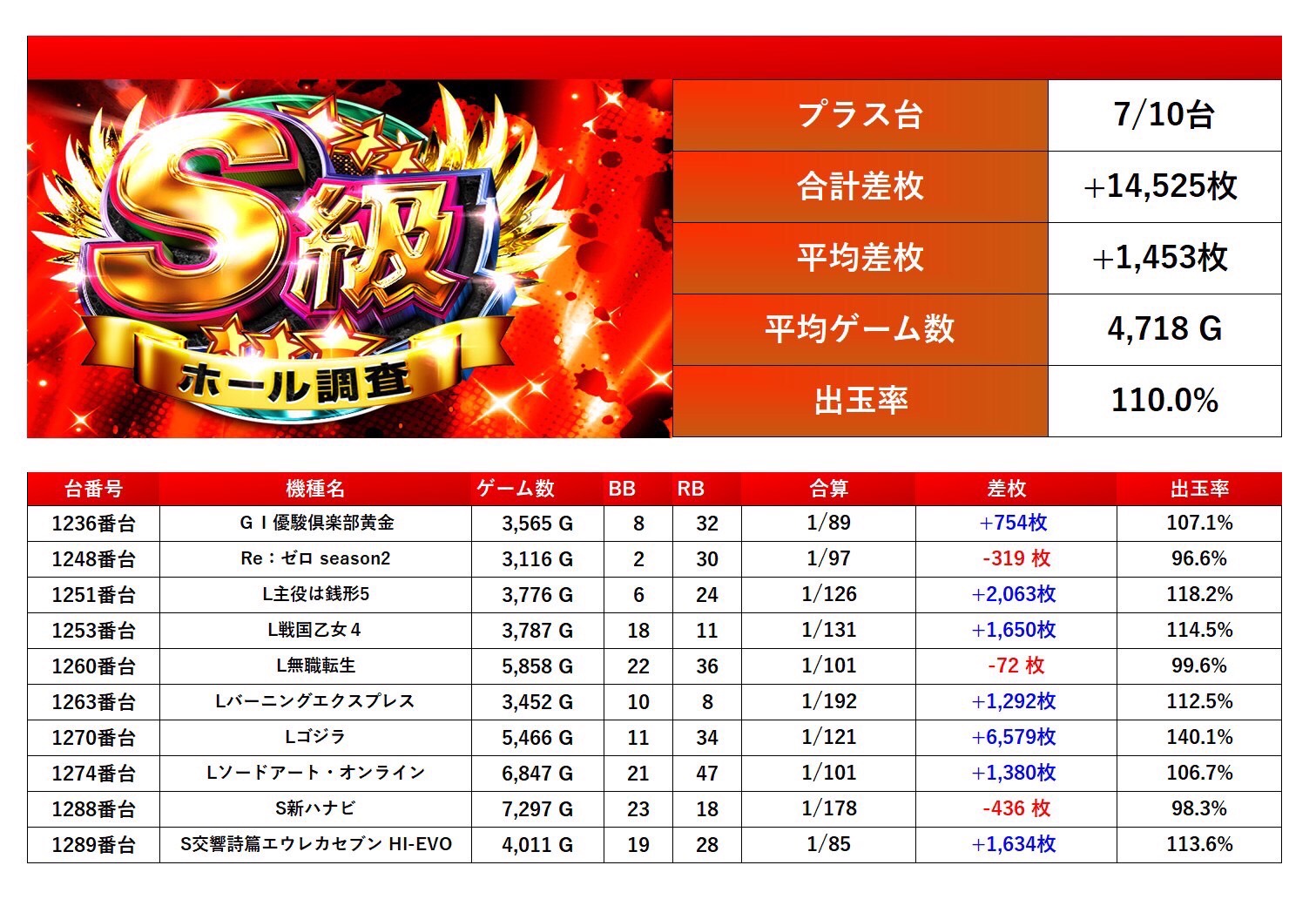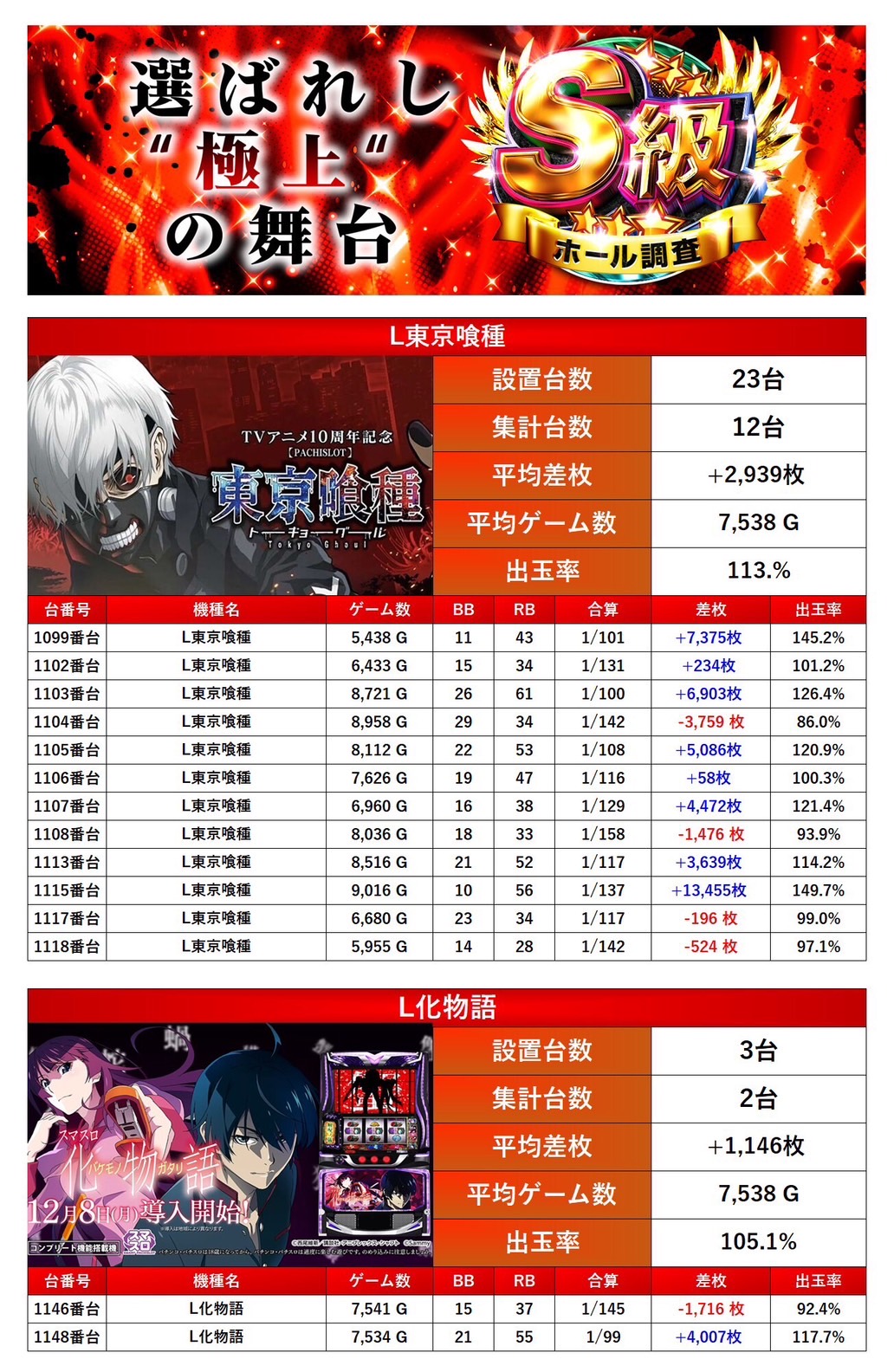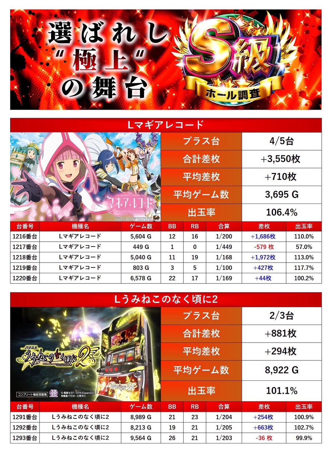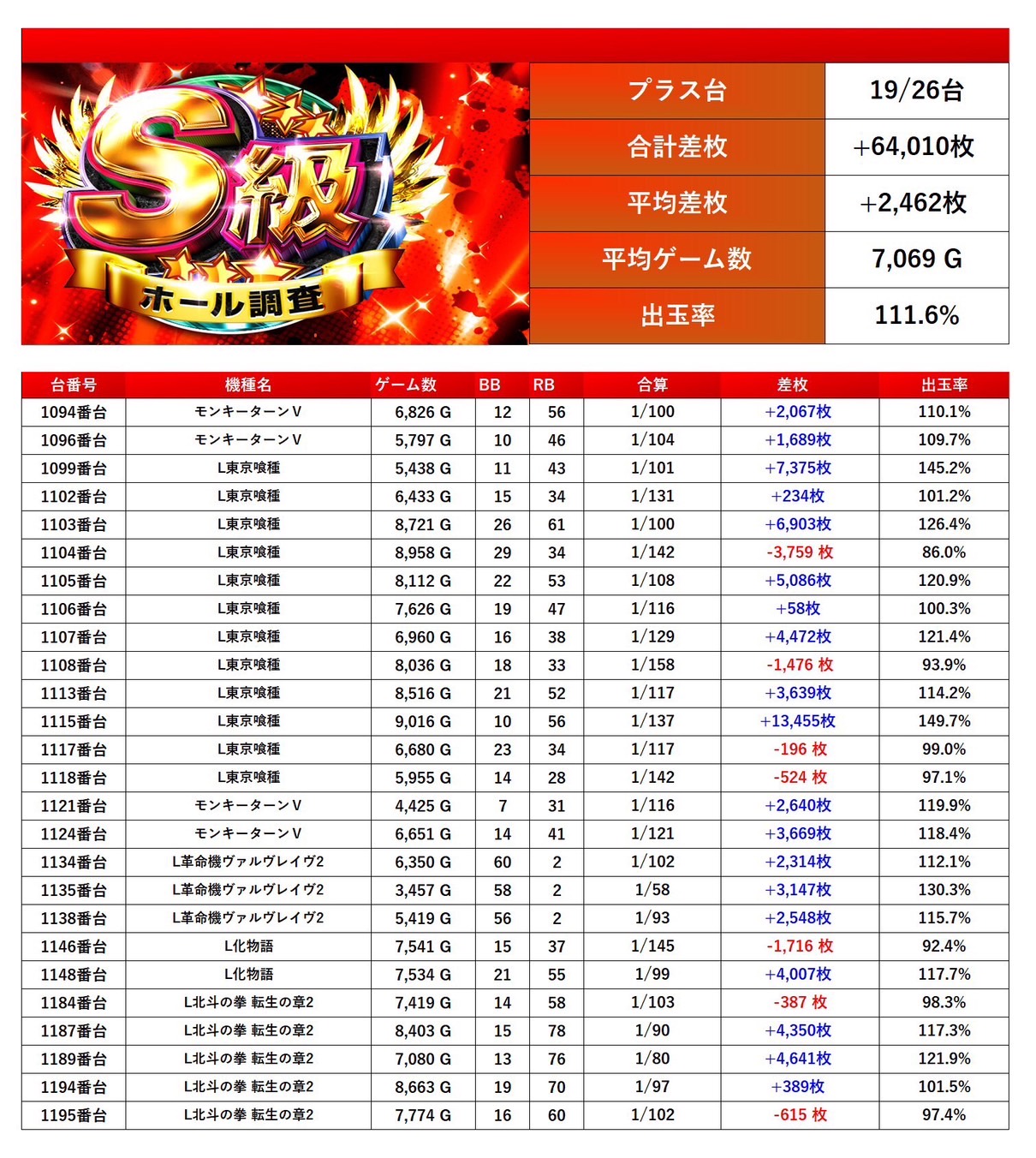 4回目の開催となるS級調査-赤-では全体からpickup率23.3%と驚愕の数値だった。今回の仕掛けをみると「メイン機種」は安定し勝率も高く腰を据えて打ち込むことが出来ただろう。「全台系」では人気機種、新台と狙いやすい仕掛けになっていた。「ニブイチ仕掛け」粘りを見せたユーザーも多く好挙動な台が多数確認できた。「2台以下設置機種」では10台がpick up、「法則に捉われない台」ではジャグラーや北斗の拳などといった機種が対象になり、ホールの出率を底上げし安定感のある営業内容だった。総じて今回は二つ星評価となった。次回も期待している。