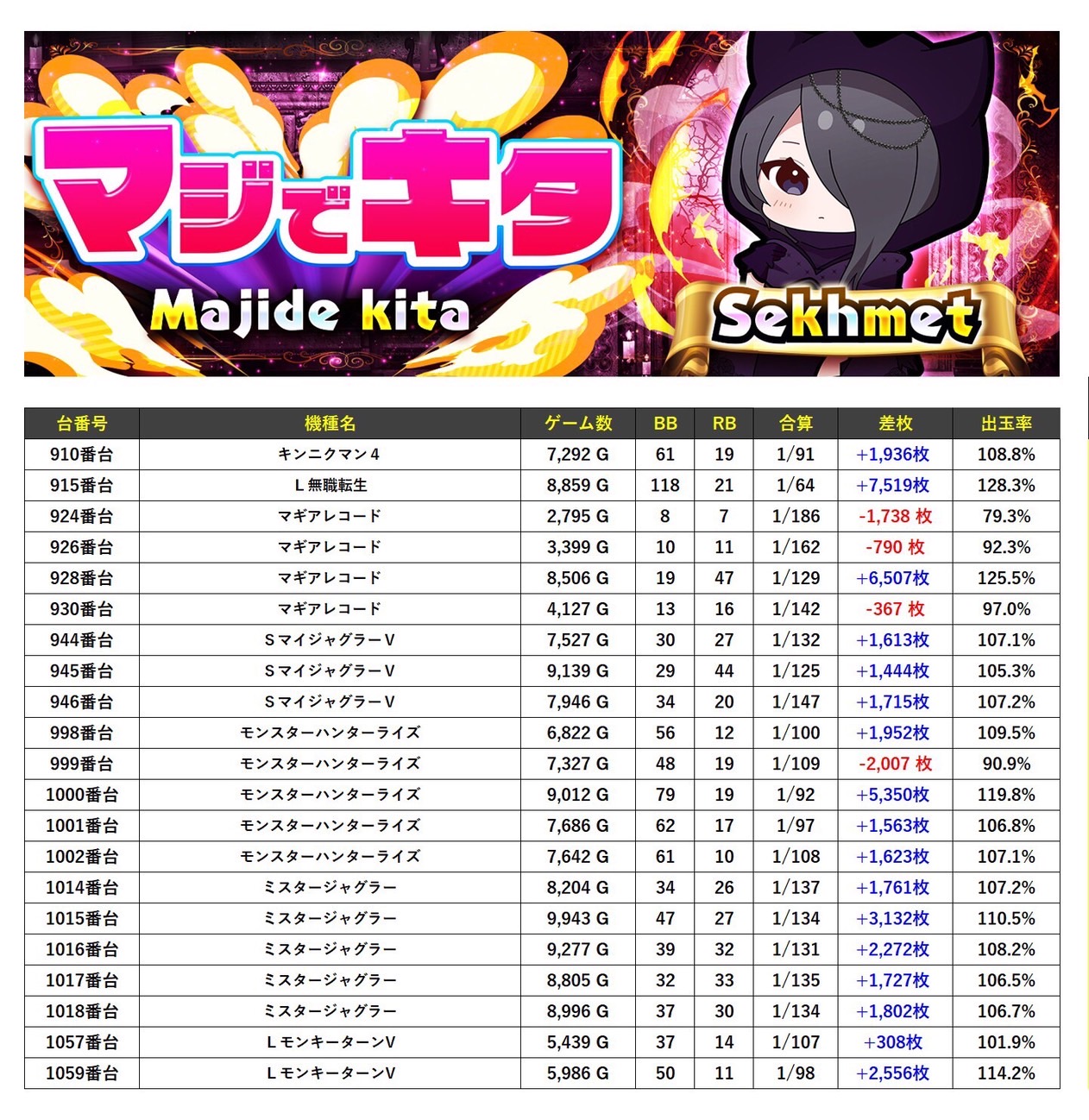 ・1台あたりの平均差枚数+1,988枚(平均出率108.9%)