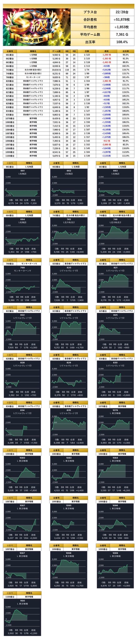 メイン優秀台28台は平均差枚+1,853枚、出率108.4%とメイン機種らしい安定感が光った。