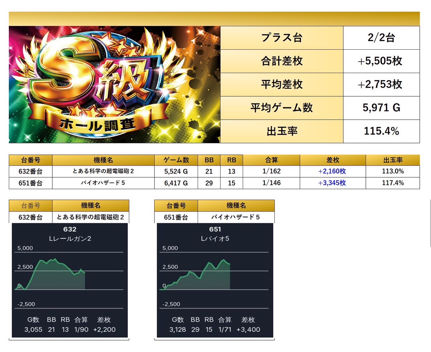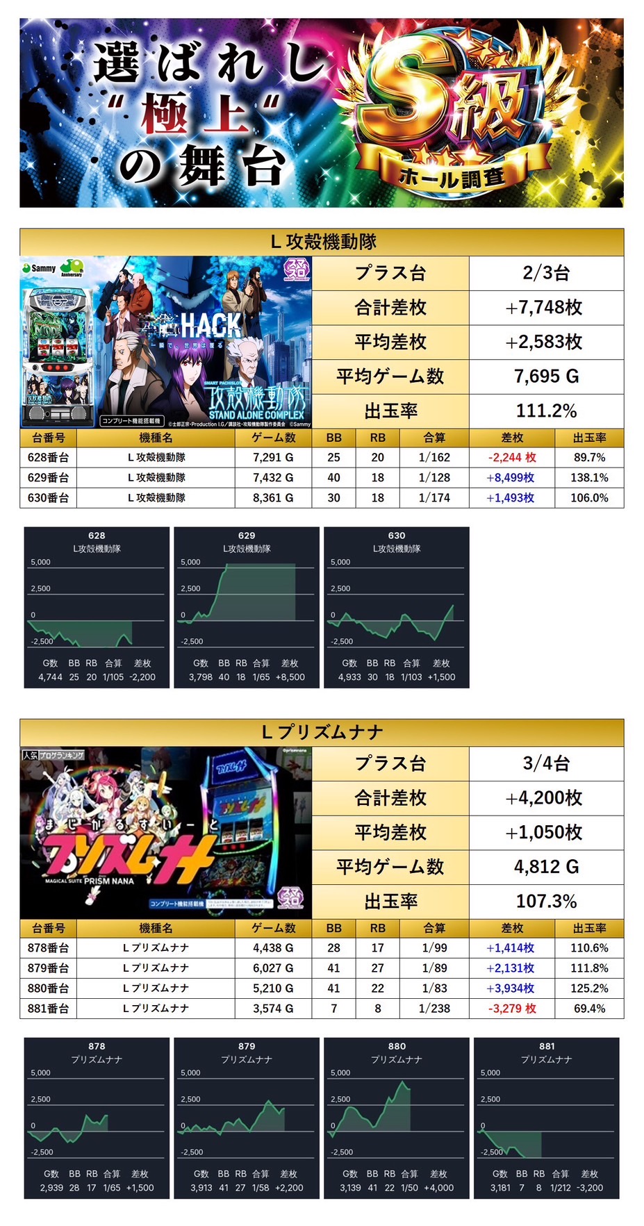 今回のS級ホール調査‐虹‐での仕掛け量は、抽選308名/一般60名と沢山のユーザーが集まり、全体でのpick up率は17.8%となり、pick up箇所の内容自体は非常に優秀で、各仕掛けにおいても高水準な結果が目立つ内容となった。一方で、全体差枚が大きくマイナスとなっている点は評価を下げる要因となり、悔しさが残る結果に。とはいえ、4台設置機種を中心に強いポイントは明確で、バランスの取れた配分で十分に勝負できる環境だったと言える。総合的には二つ星評価となるが、全体の底上げが加わればさらに上位評価も狙えるポテンシャルを感じる内容だった。次回の開催も期待している。