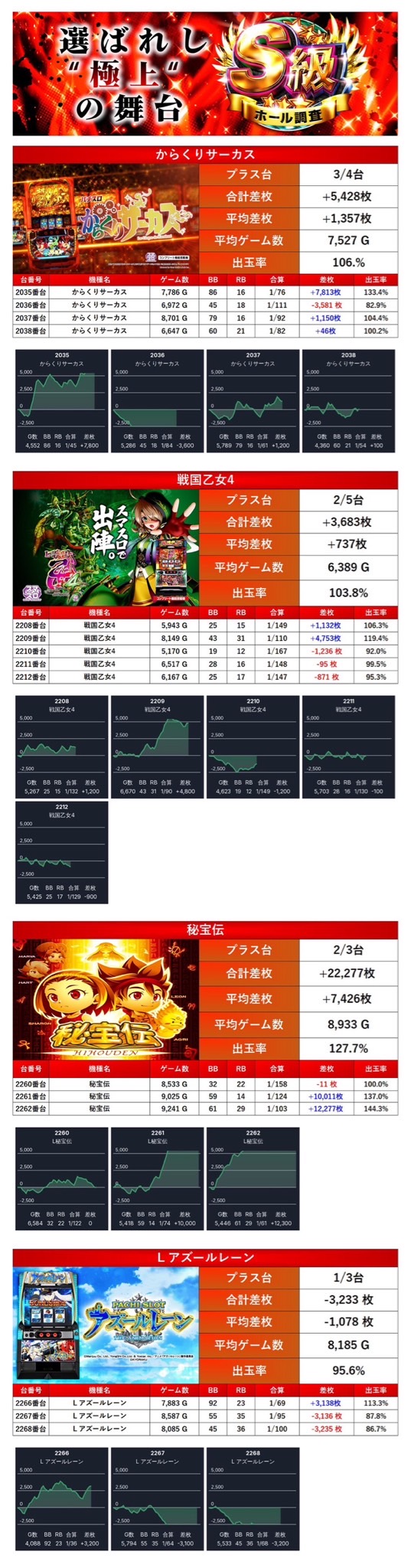 「からくりサーカス」「戦国乙女4」「秘宝伝」「Lアズールレーン」の4機種15台が全台系としてpick up。