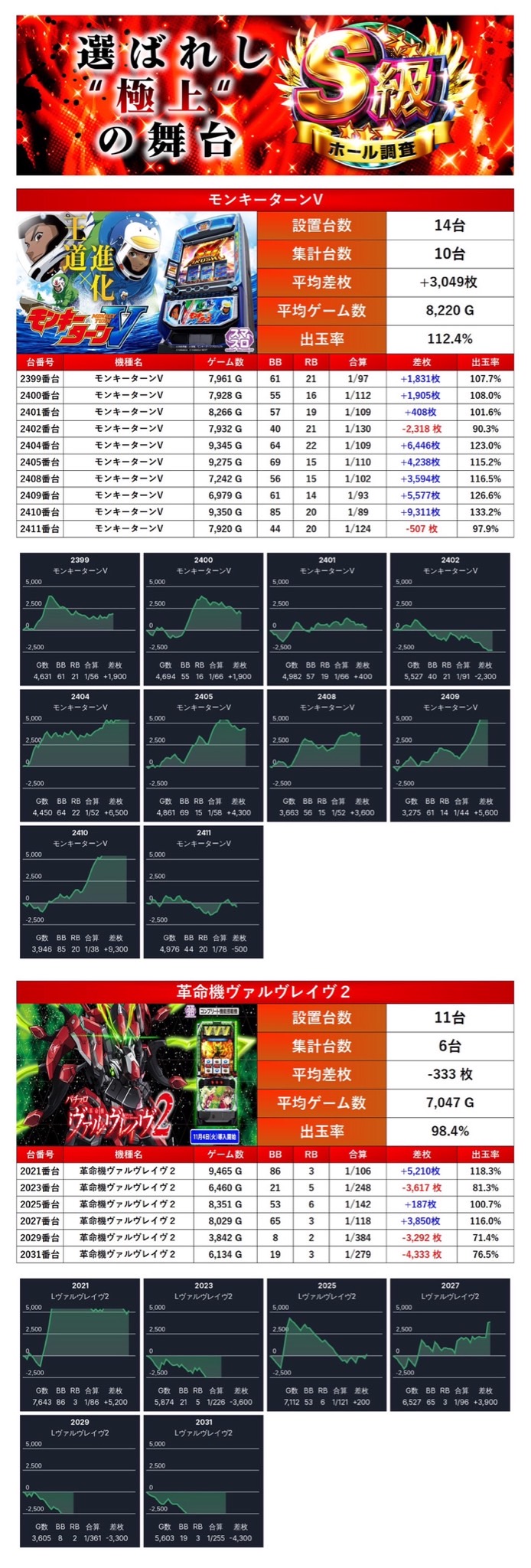 初開催となった今回のS級調査-赤-は、全体でのpick up率は15.4%と安定した数値の仕掛け量で、全体差枚+19,250枚/平均+55枚とユーザープラスを達成しつつ、各仕掛けがバランス良く機能した“安定感重視”の内容となった。大きな爆発力こそ控えめではあるものの、メイン機種を軸に全台系では人気機種からの仕掛けで狙いやすかった。特に目を惹いたニブイチ仕掛けでは多彩な機種が用意されており、どこからでも勝負できる環境が整っていた点は評価できる。集計された機種の出率も申し分なく、総じて堅実な仕上がりの二つ星評価。今後はさらなる出玉インパクトの強化にも期待したい。