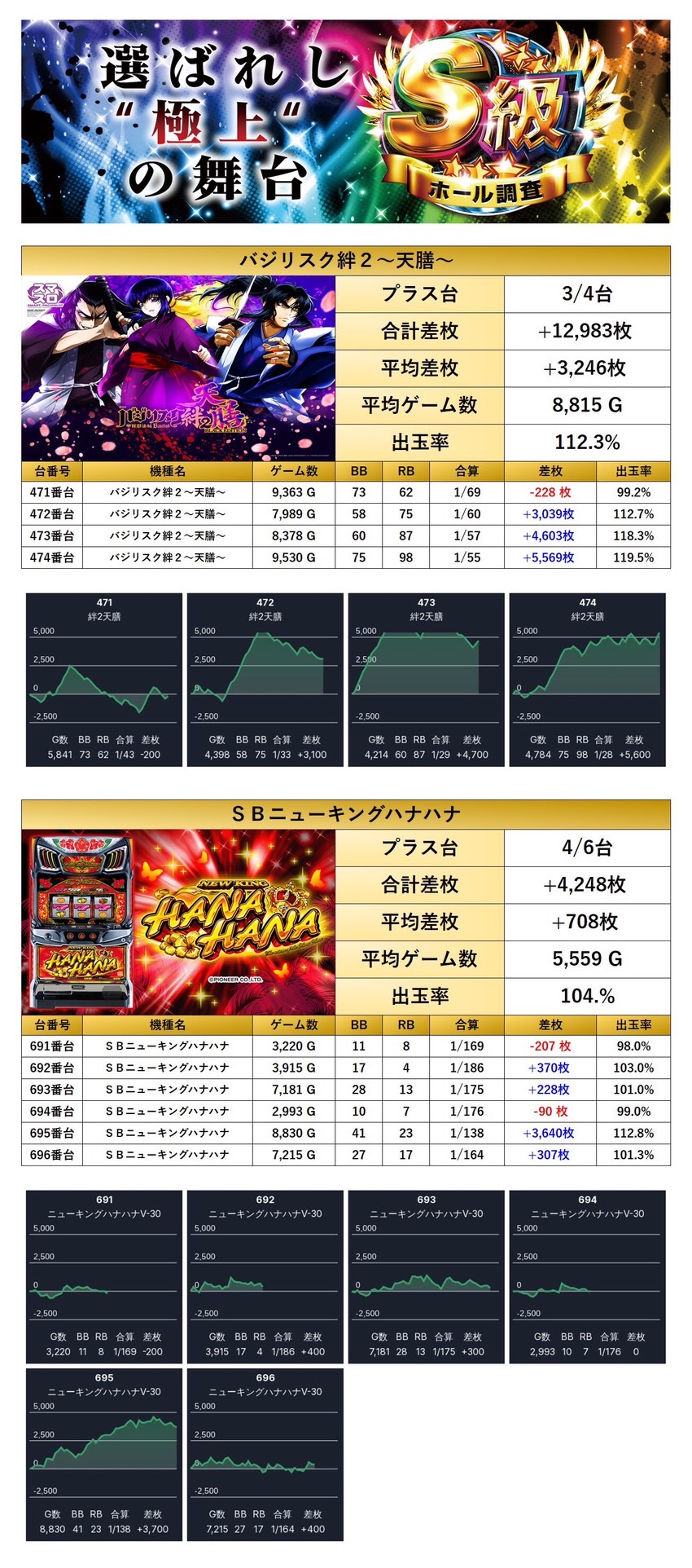 「バジリスク絆2~天膳~」「SBニューキングハナハナ」の2機種10台がpick up。
