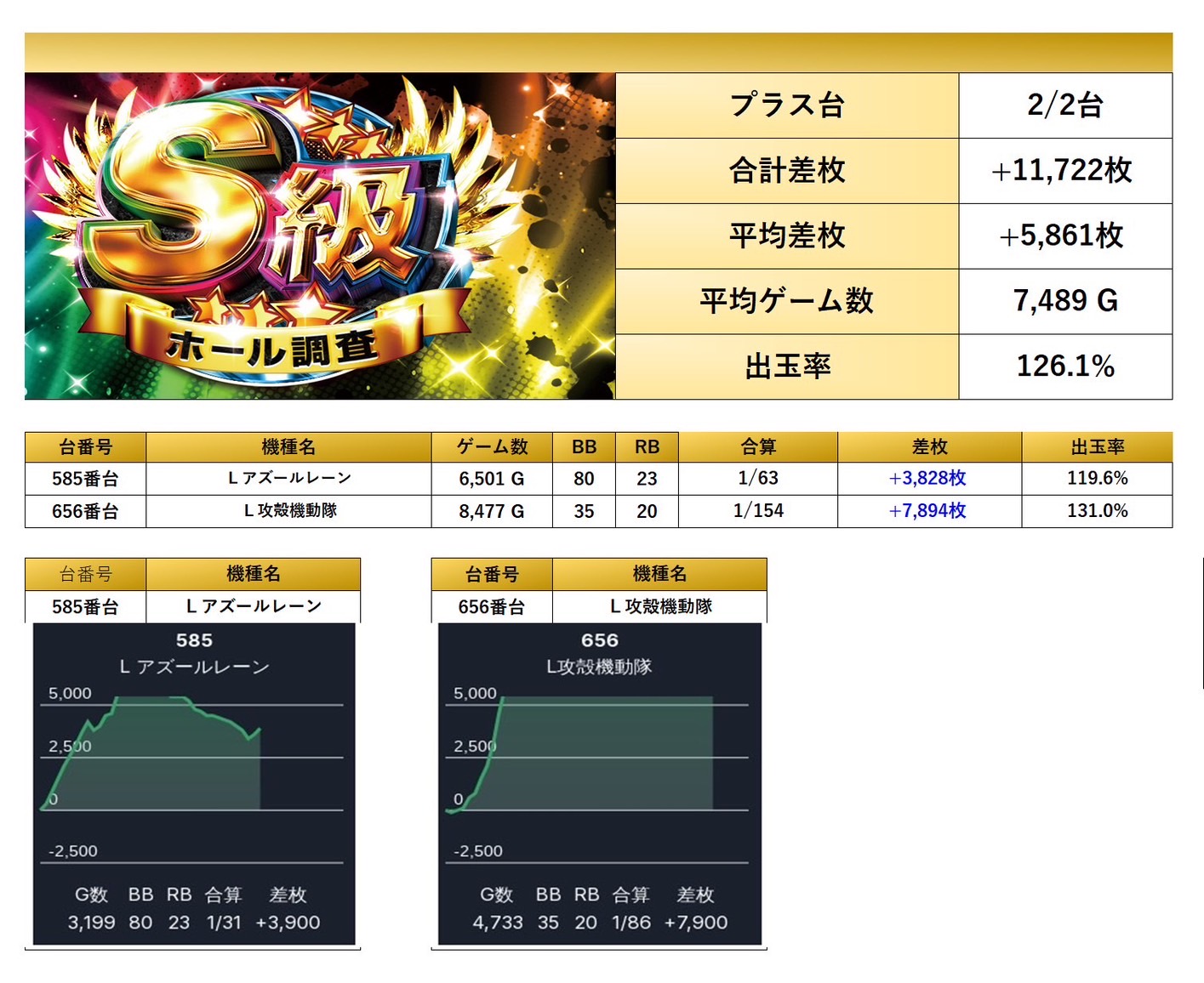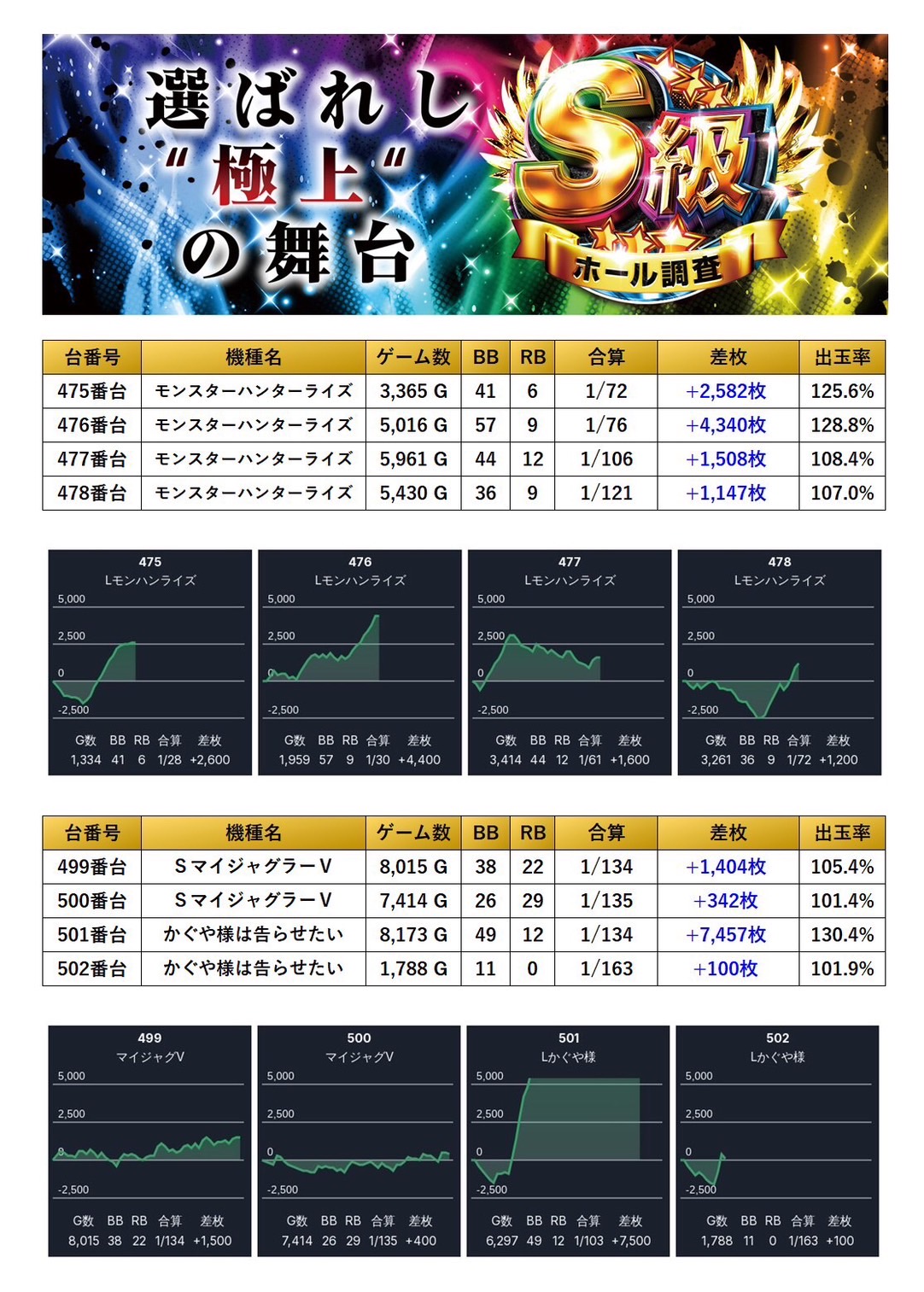 全体から4台をpick upする。平均差枚+5,861枚、出率126.1%と突出した数値を記録し、強烈なインパクトを放っていた。