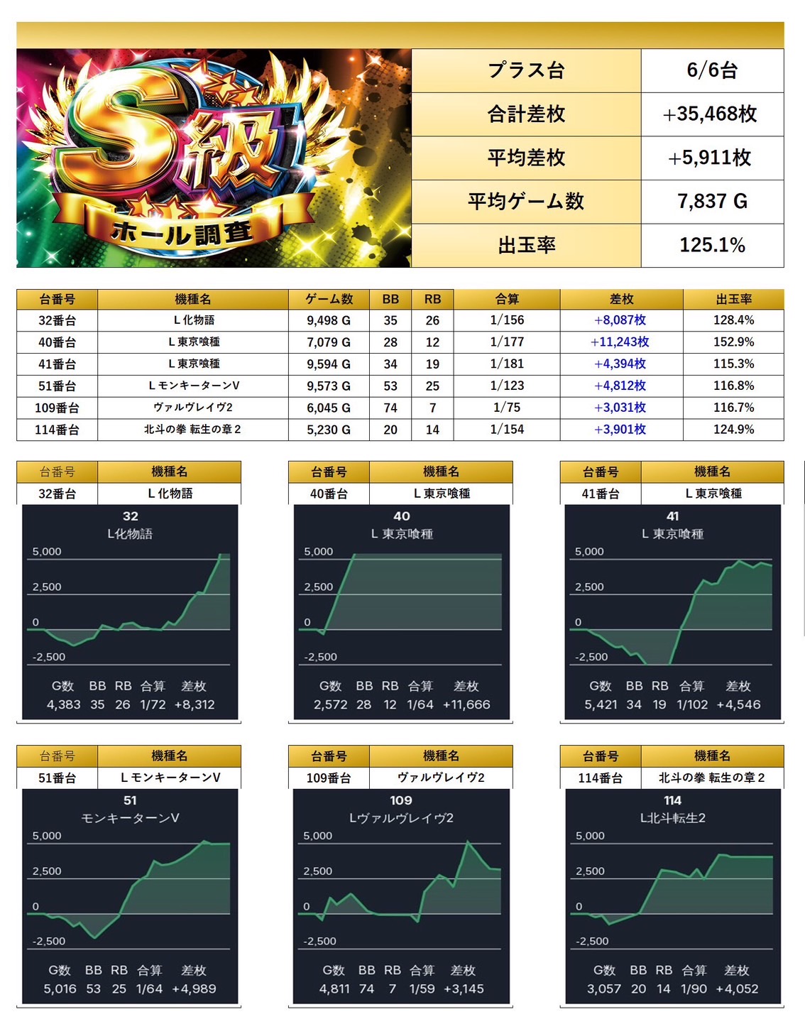 平均差枚+5,911枚、出率125.1%と驚異的な数値を記録。台数は絞られているものの、その分しっかりと出玉が付いており、ピンポイントでの強い仕掛けが印象的だった。