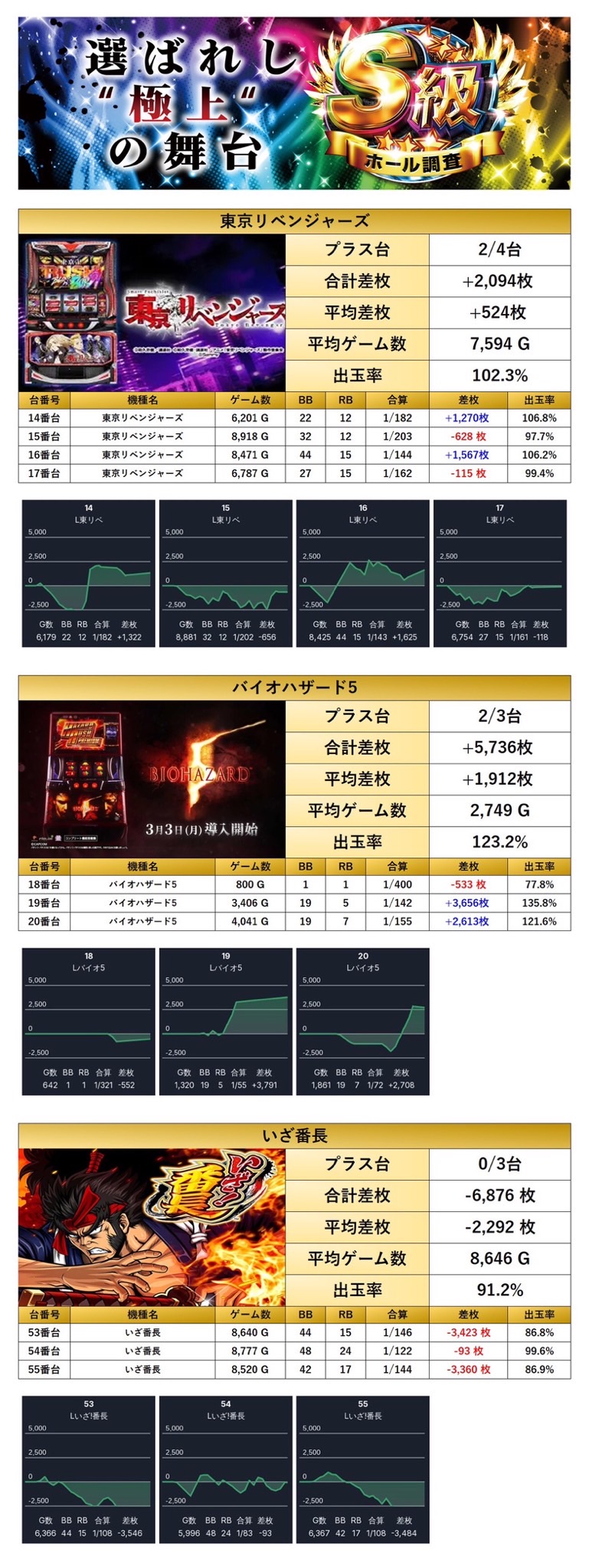 「東京リベンジャーズ」「バイオハザード5」「いざ番長」の3機種・計10台が全台系としてピックアップ。