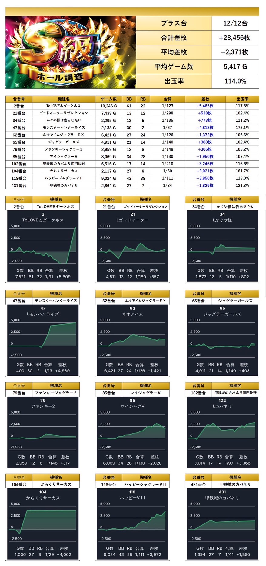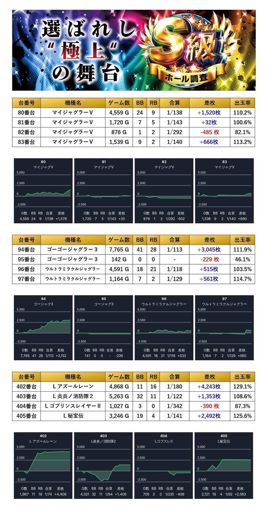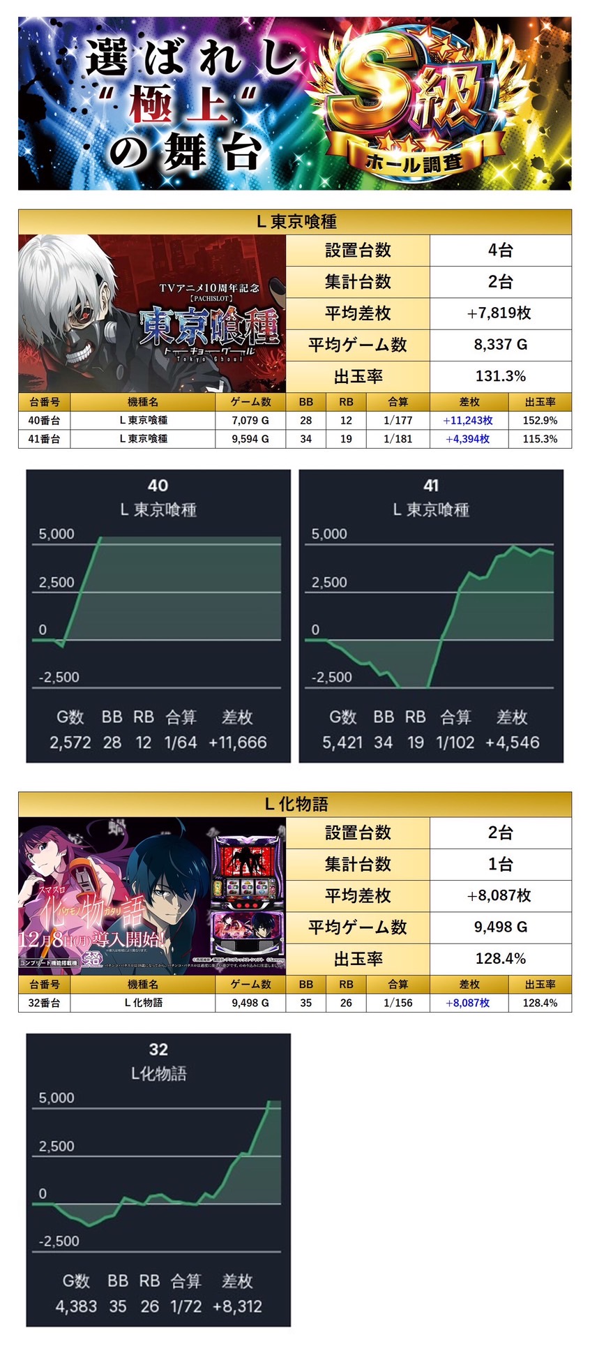 平均差枚+7,908枚、出率130.2%と今回トップクラスどころか突出した数値を記録。台数は少ないながらも、破壊力抜群の仕掛けが投入されていた。