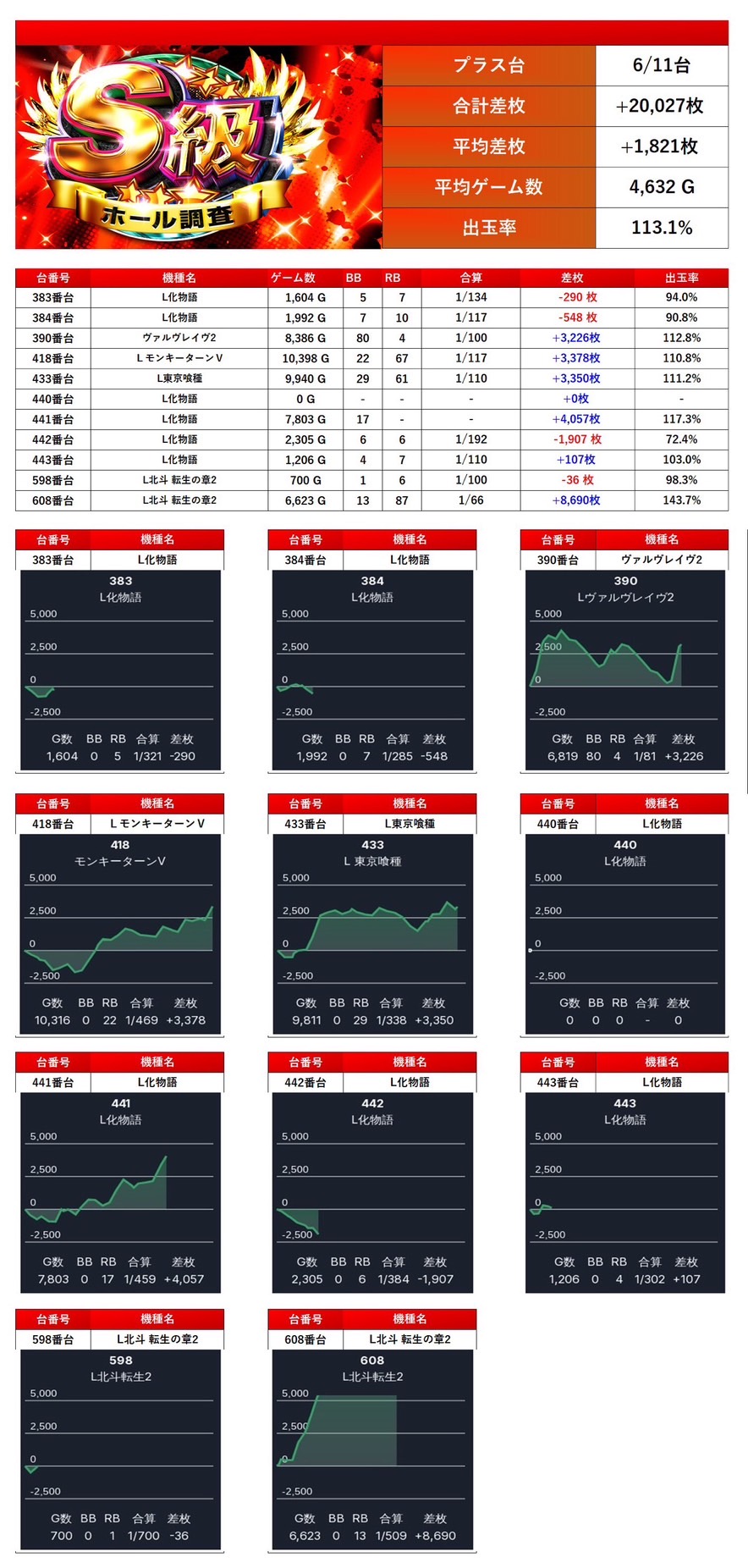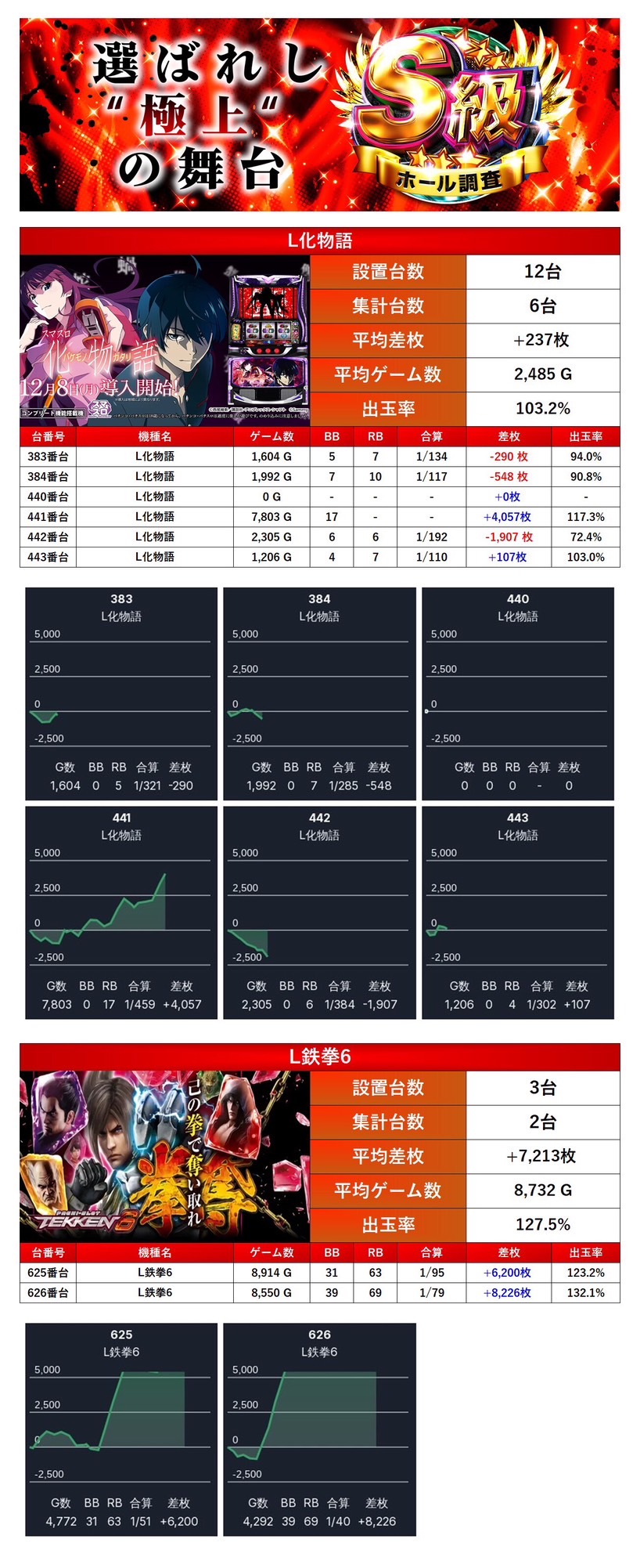 平均差枚+1,981枚、出率116.3%と鉄拳6では出率面で非常に優秀な数値を記録したが、一方で化物語は打ち込みが足りず、ポテンシャルを発揮できずに終わった。
