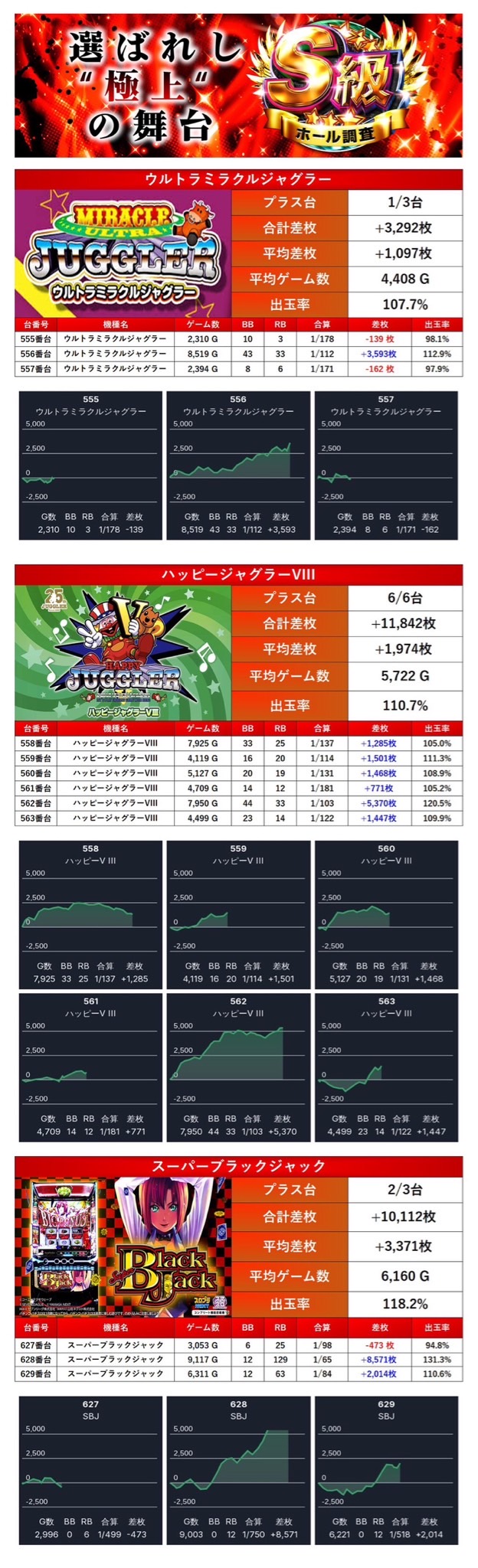 38回目となったS級調査-赤-ではpick up率は8.9%と控えめではあるものの、全体差枚は+30,660枚/平均+105枚とプラスを達成し、ピックアップ箇所では高出率の114%記録し、三つ星を獲得。