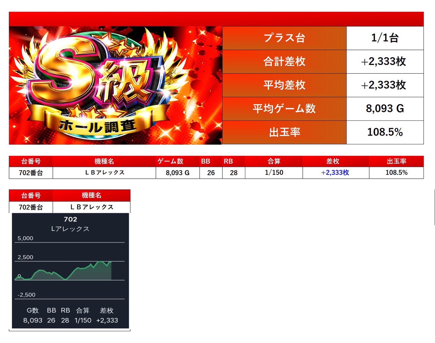 均差枚+2,333枚、出率108.5%としっかりプラスを記録。