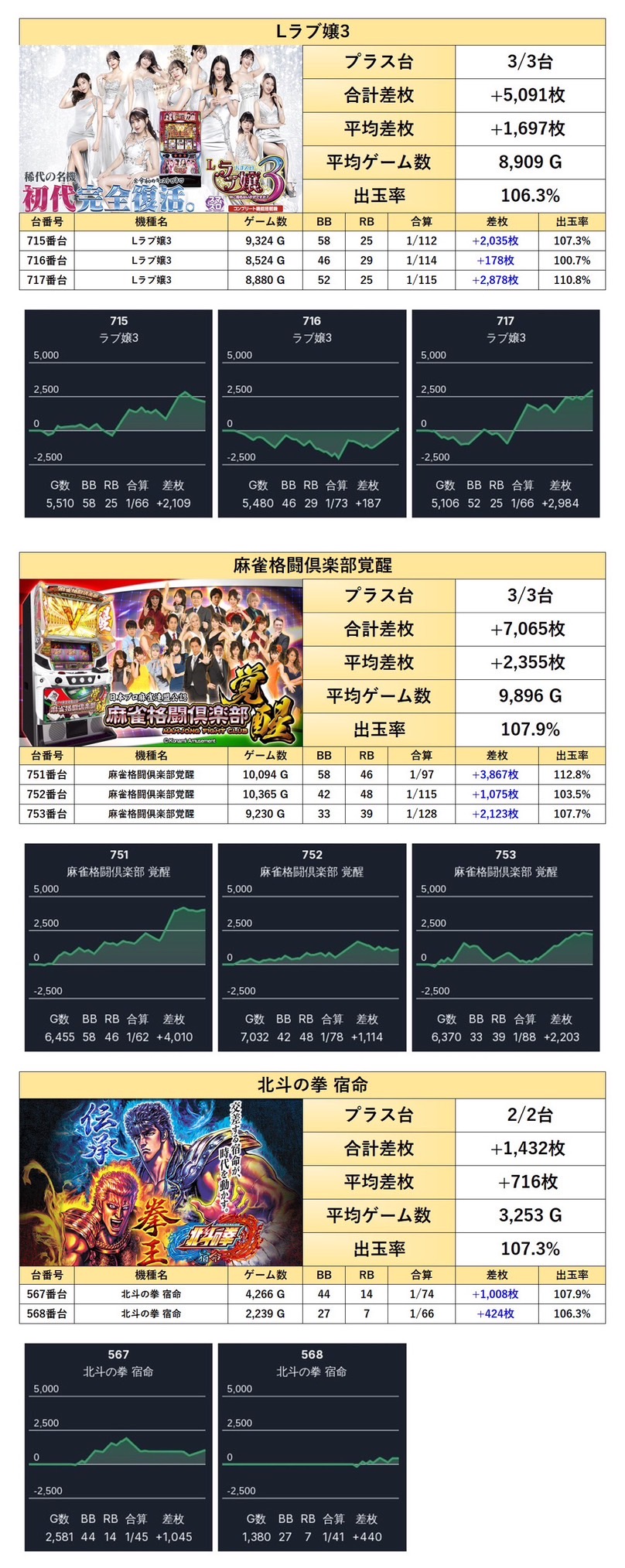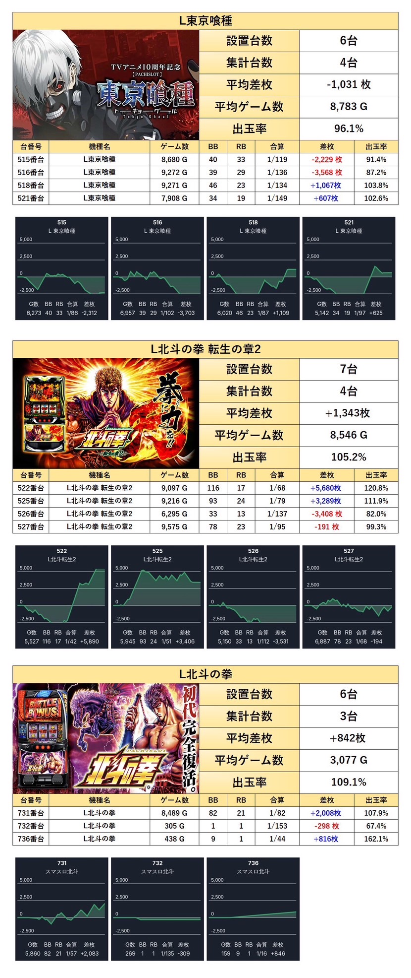 他に店舗と同じく全台仕掛け2機種、半分仕掛け3機種の合計5機種で仕掛けがあった。今回の営業はpick up率6.5%と少数精鋭型の配分。今後の仕掛けの強弱にも注目していきたい。