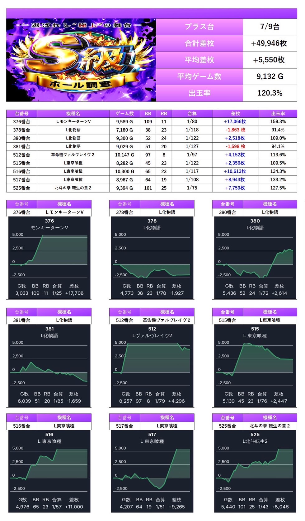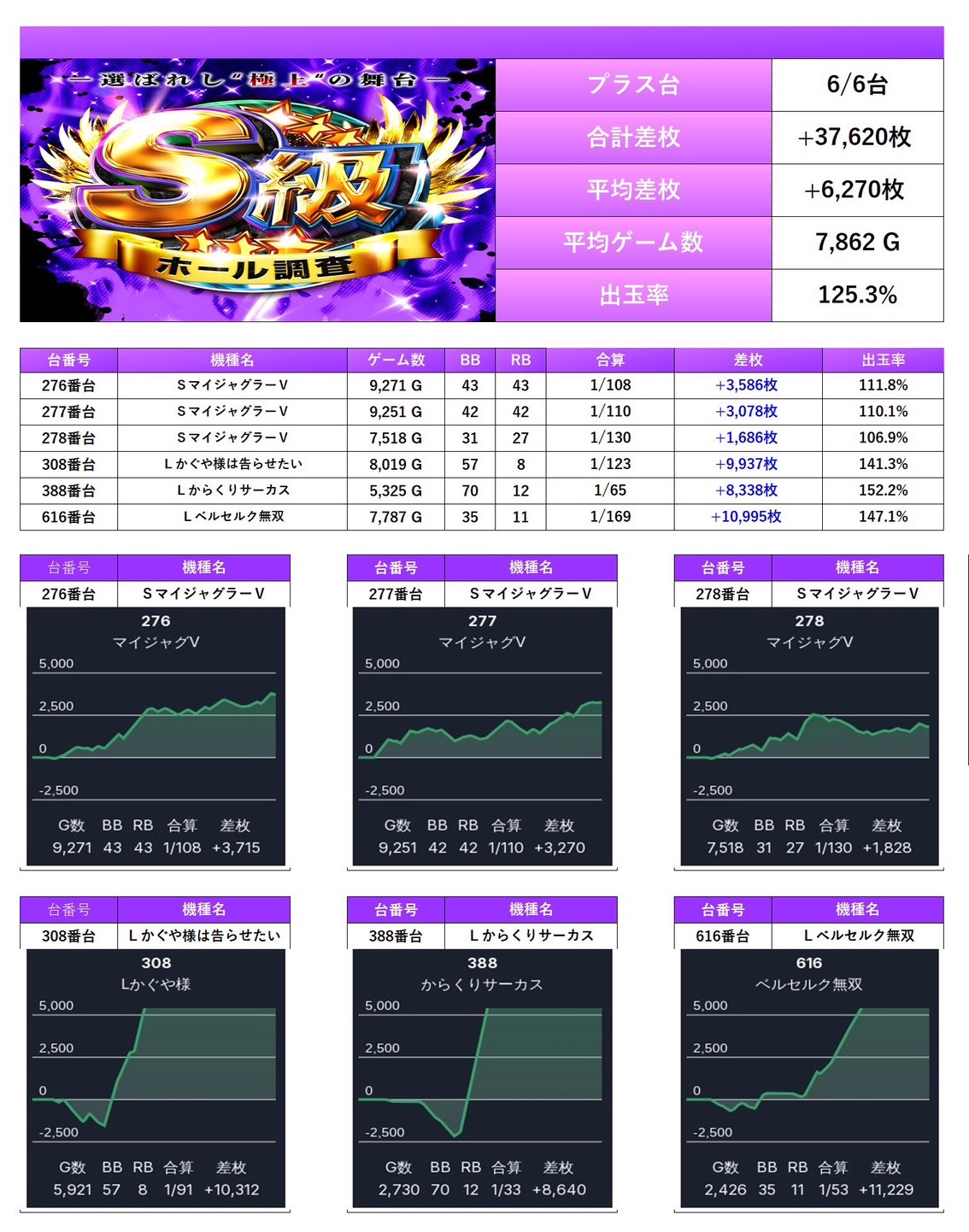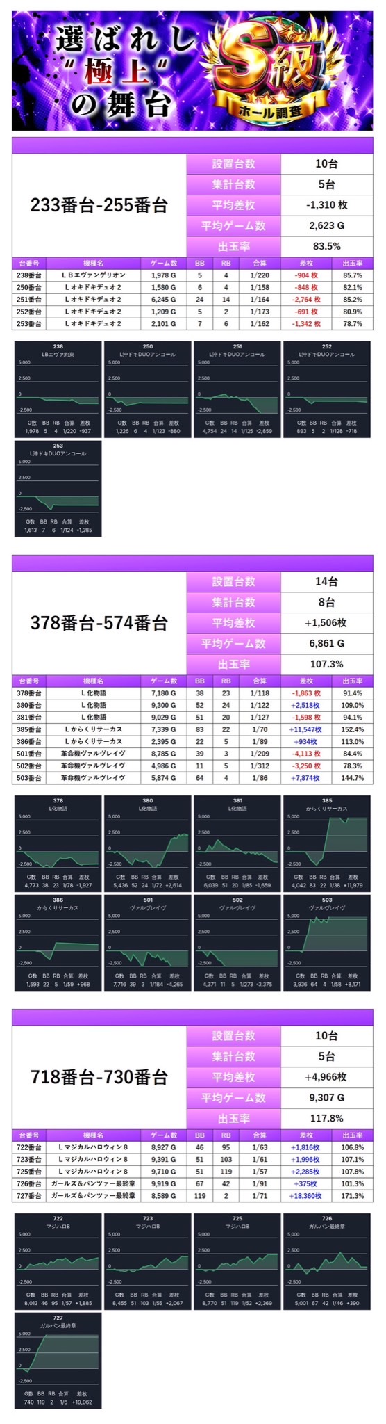 7回目のS級ホール調査‐紫‐ではpick up率は13.1%となり、仕掛け量も安定していた。全体差枚は+6,358枚/平均+22枚と控えめながら、内容面は非常にハイレベルでまとまった一日。