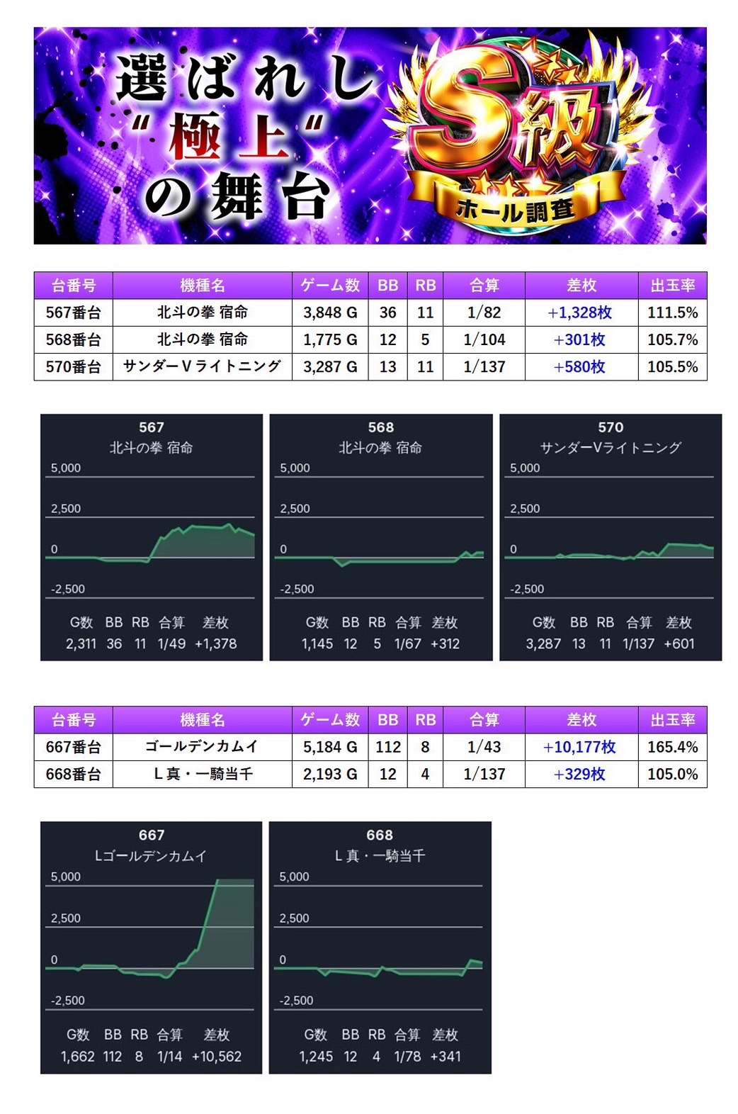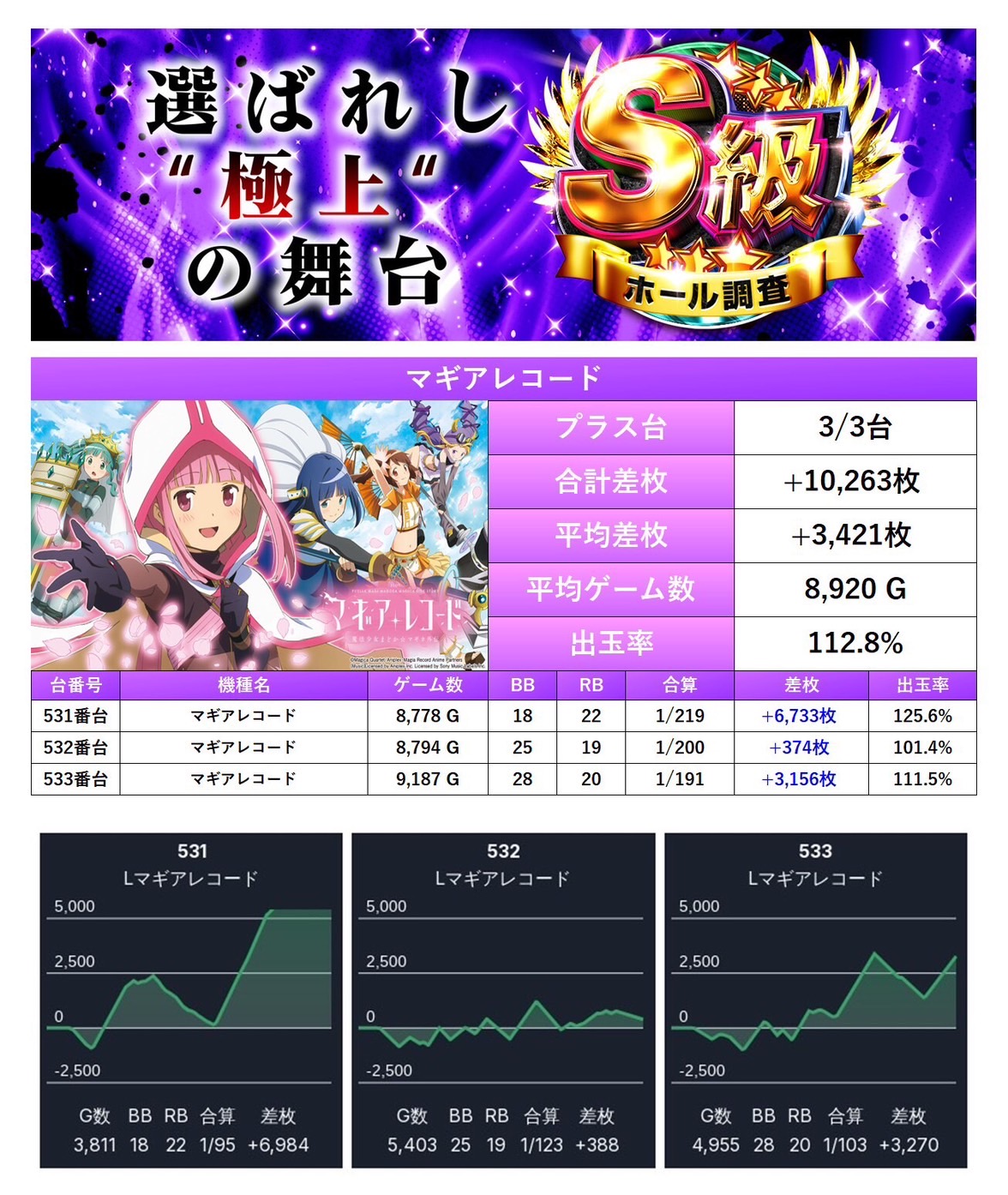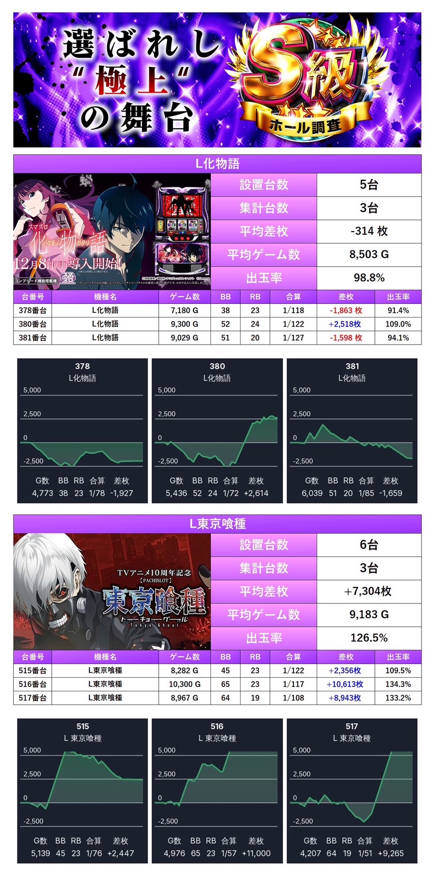 7回目のS級ホール調査‐紫‐ではpick up率は13.1%となり、仕掛け量も安定していた。全体差枚は+6,358枚/平均+22枚と控えめながら、内容面は非常にハイレベルでまとまった一日。