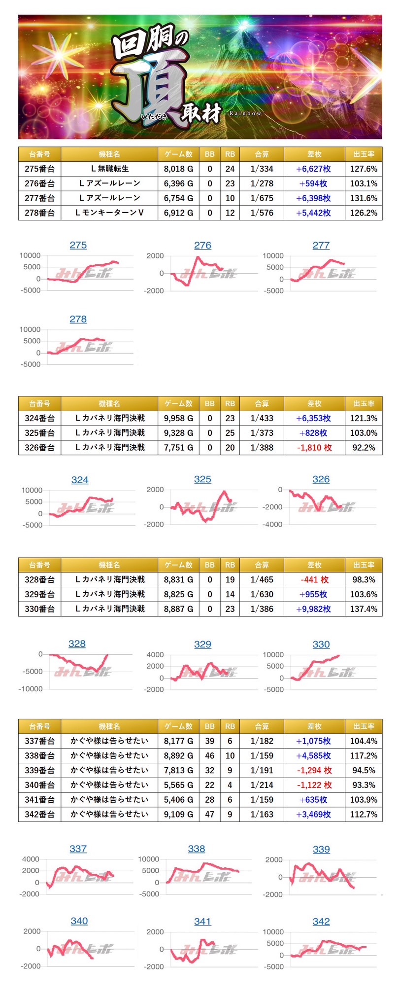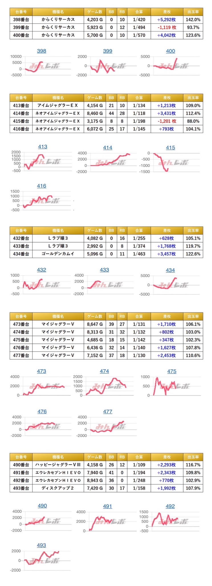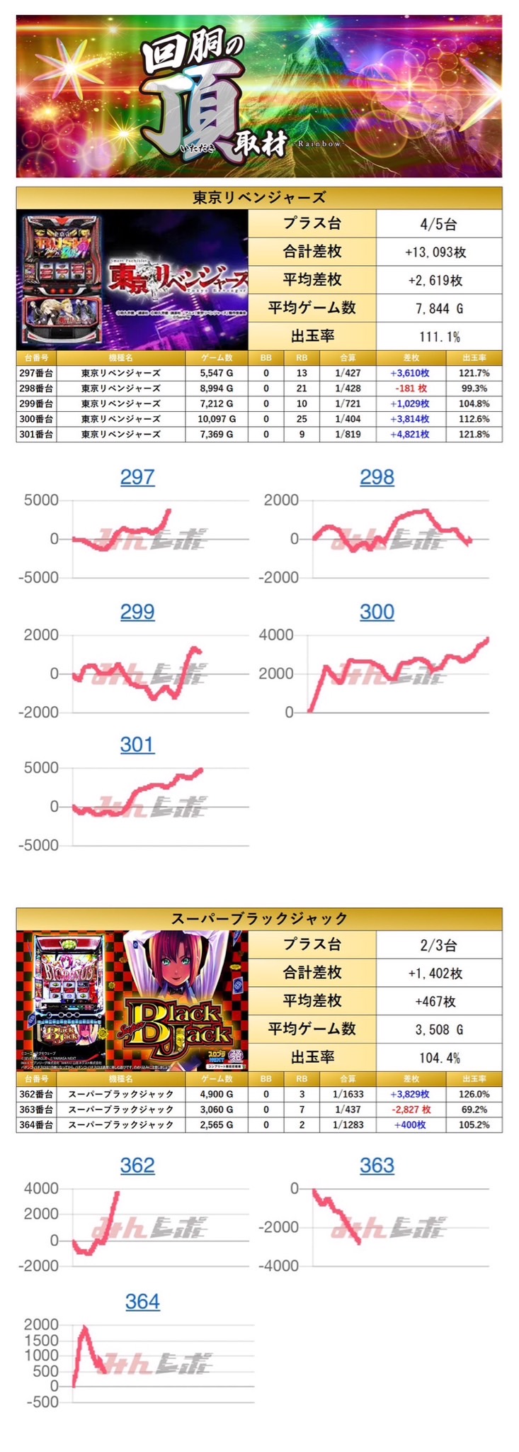「東京リベンジャーズ」「スーパーブラックジャック」の2機種8台をpick up。平均差枚は+1,812枚で平均出率が109.7%だった。