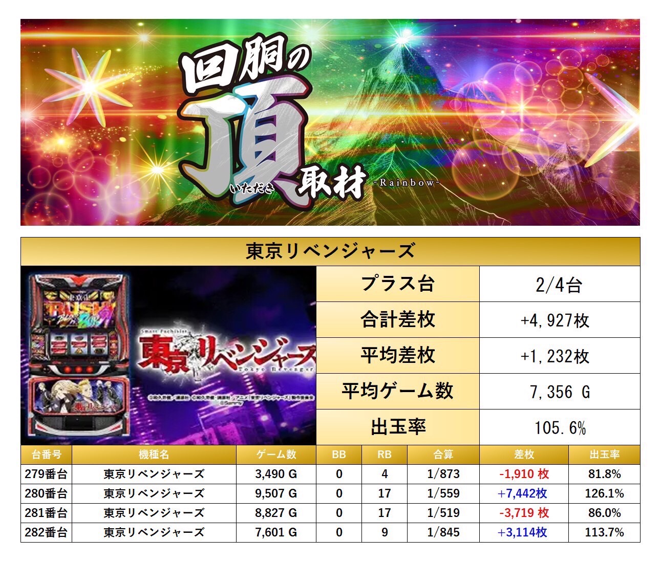 「東京リベンジャーズ」の1機種4台を見つけることができた。平均差枚は+1,232枚で平均出率が105.6%だった。