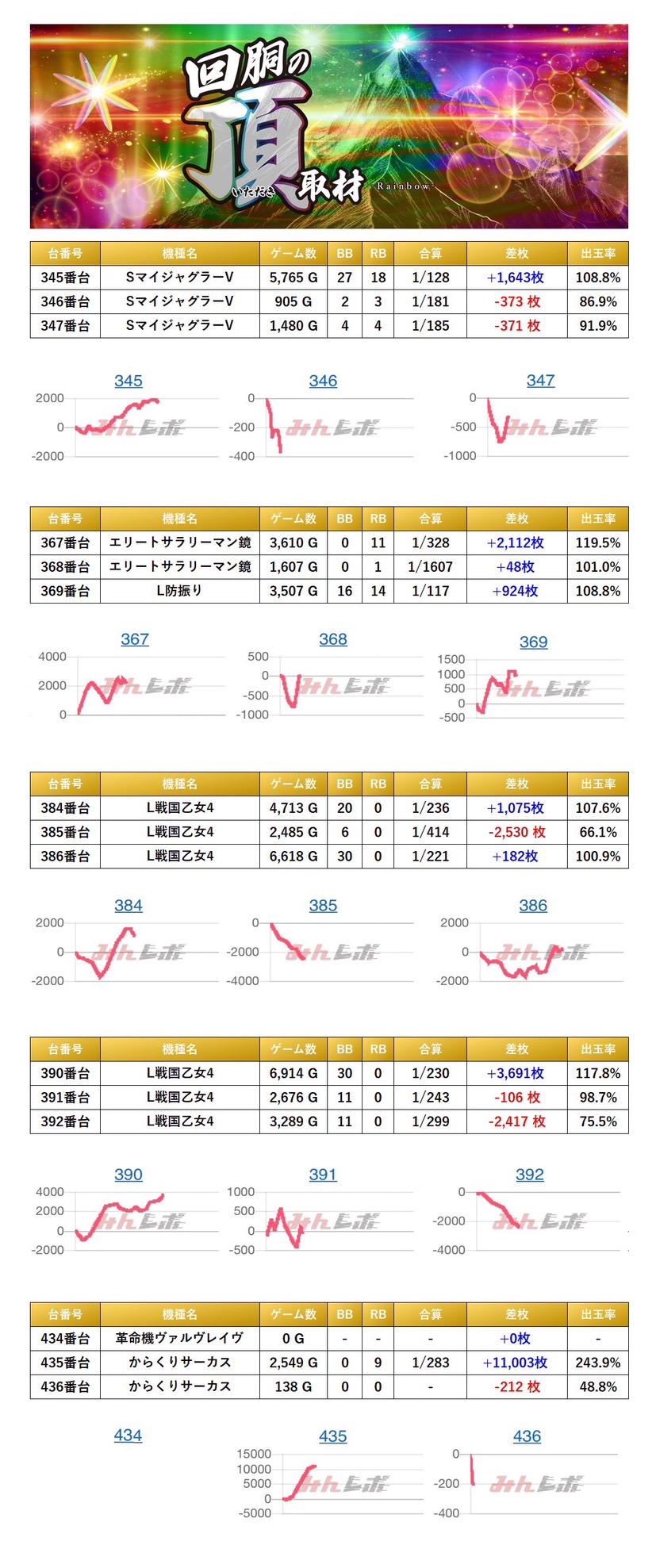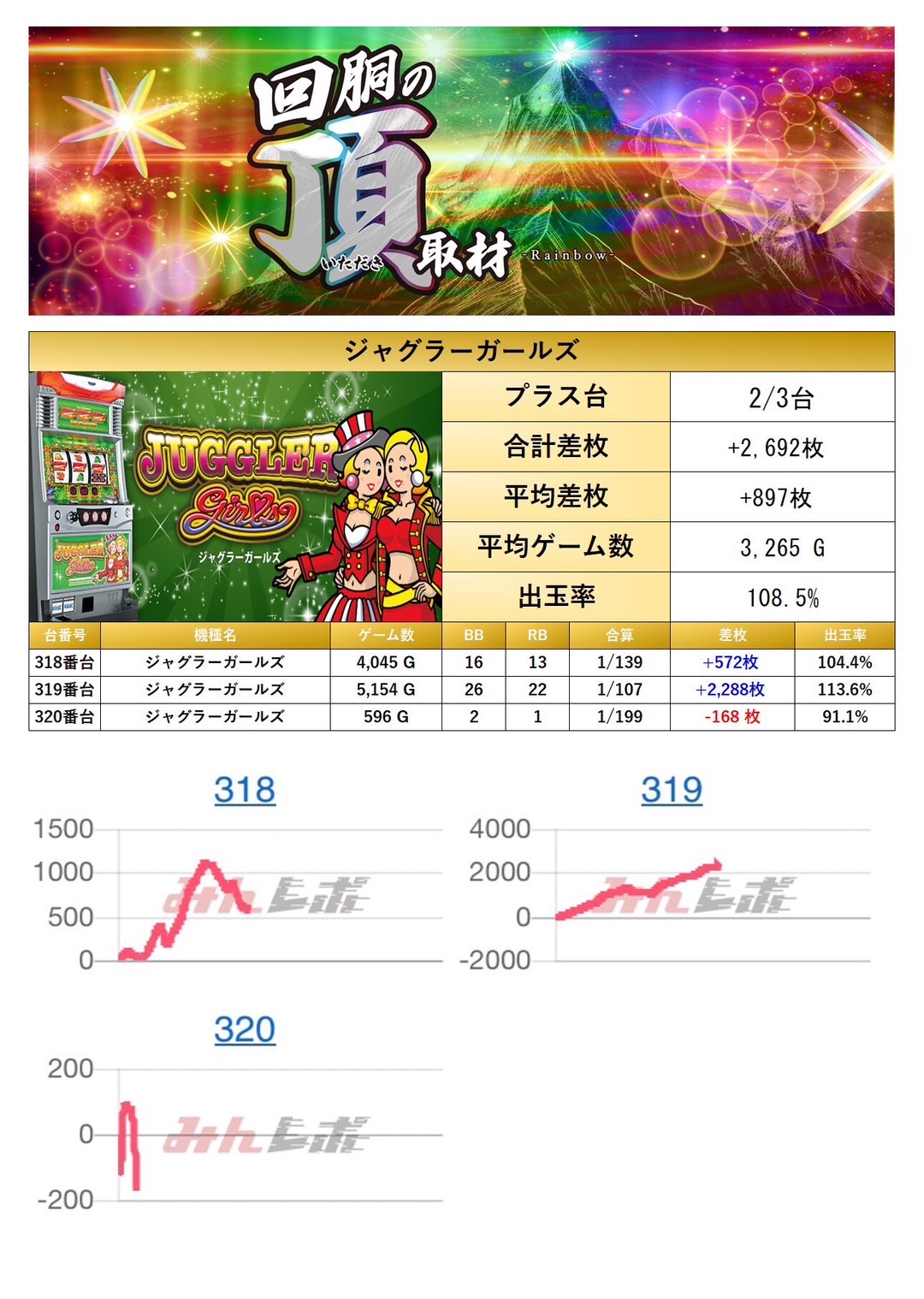 「ジャグラーガールズ」1機種3台をpick upする。平均差枚は+897枚で平均出率が108.5%となった。