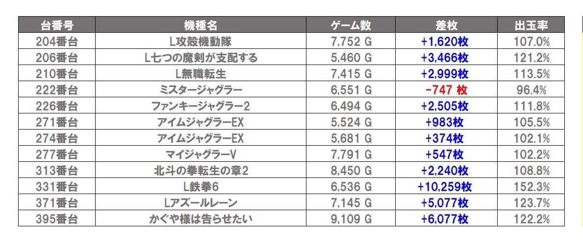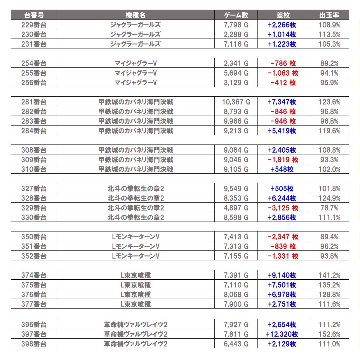 随所で優秀台を12台pick upする。平均差枚は+2,950枚、平均出率113.7%となった。