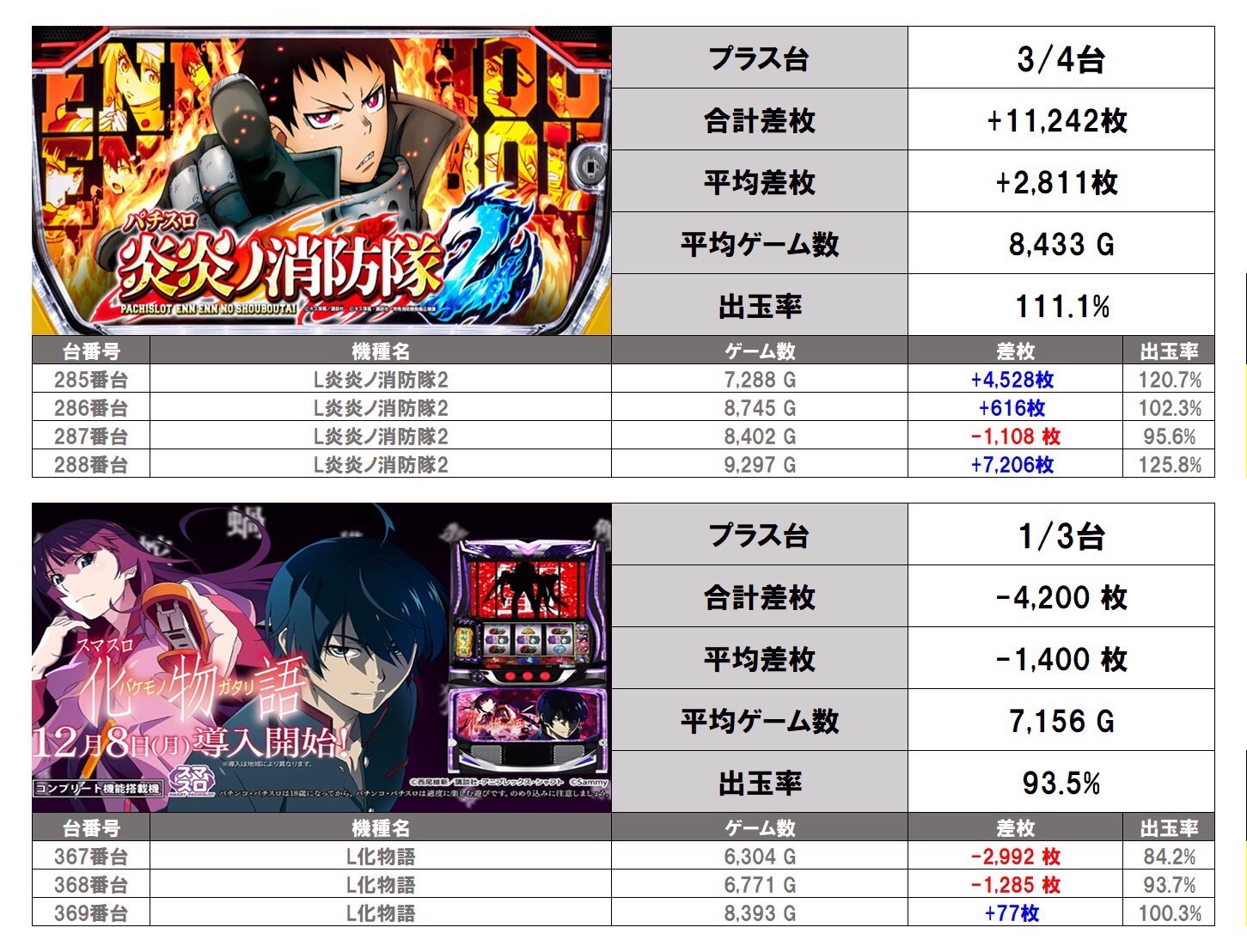 「炎炎の消防隊2」「化物語」の2機種をpick up。平均差枚は+1,006枚、平均出率104.3%となった。