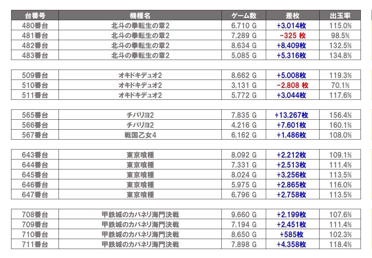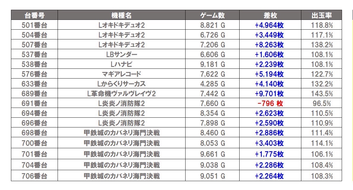 随所で優秀台を16台pick upする。平均差枚は+3,537枚、平均出率115.0%となった。